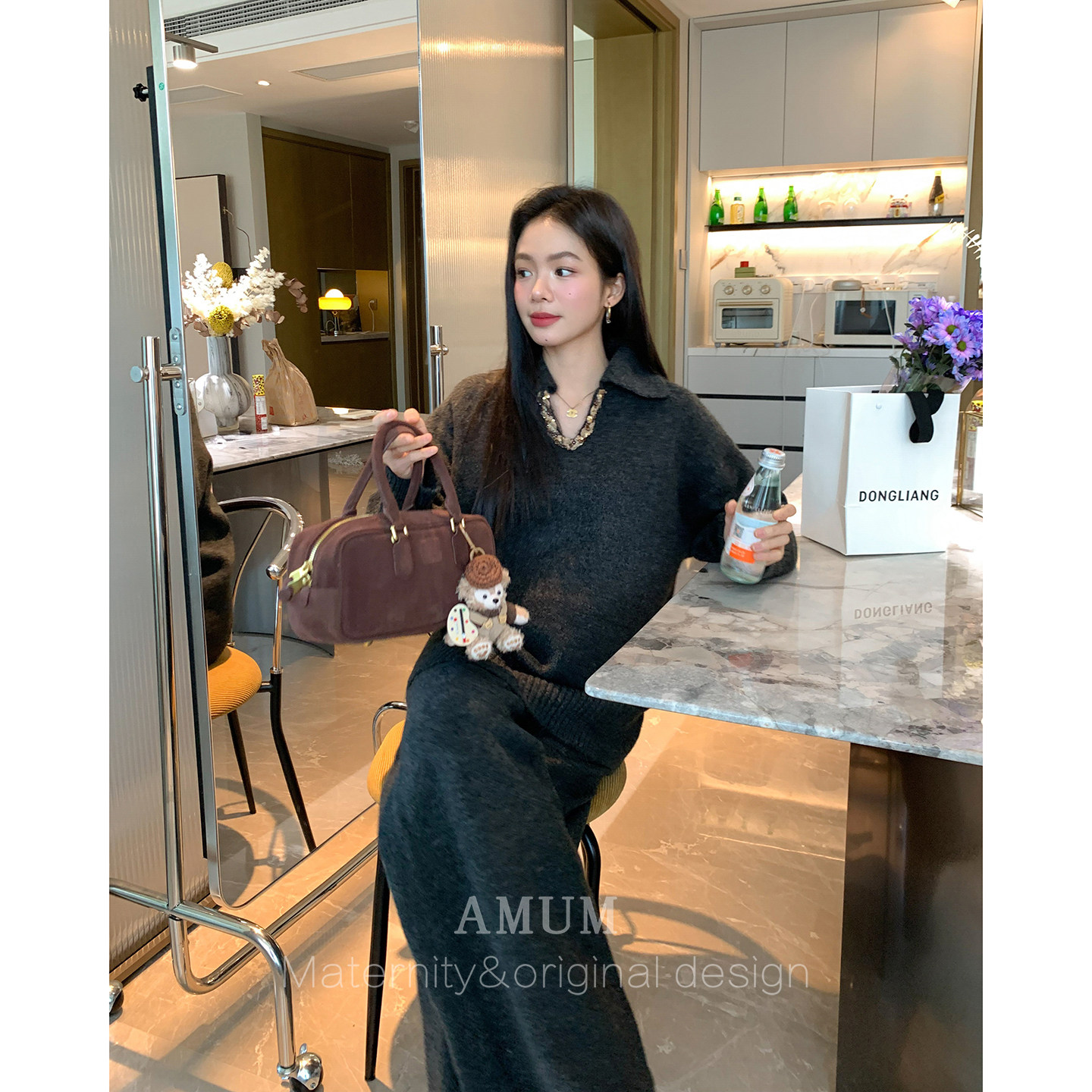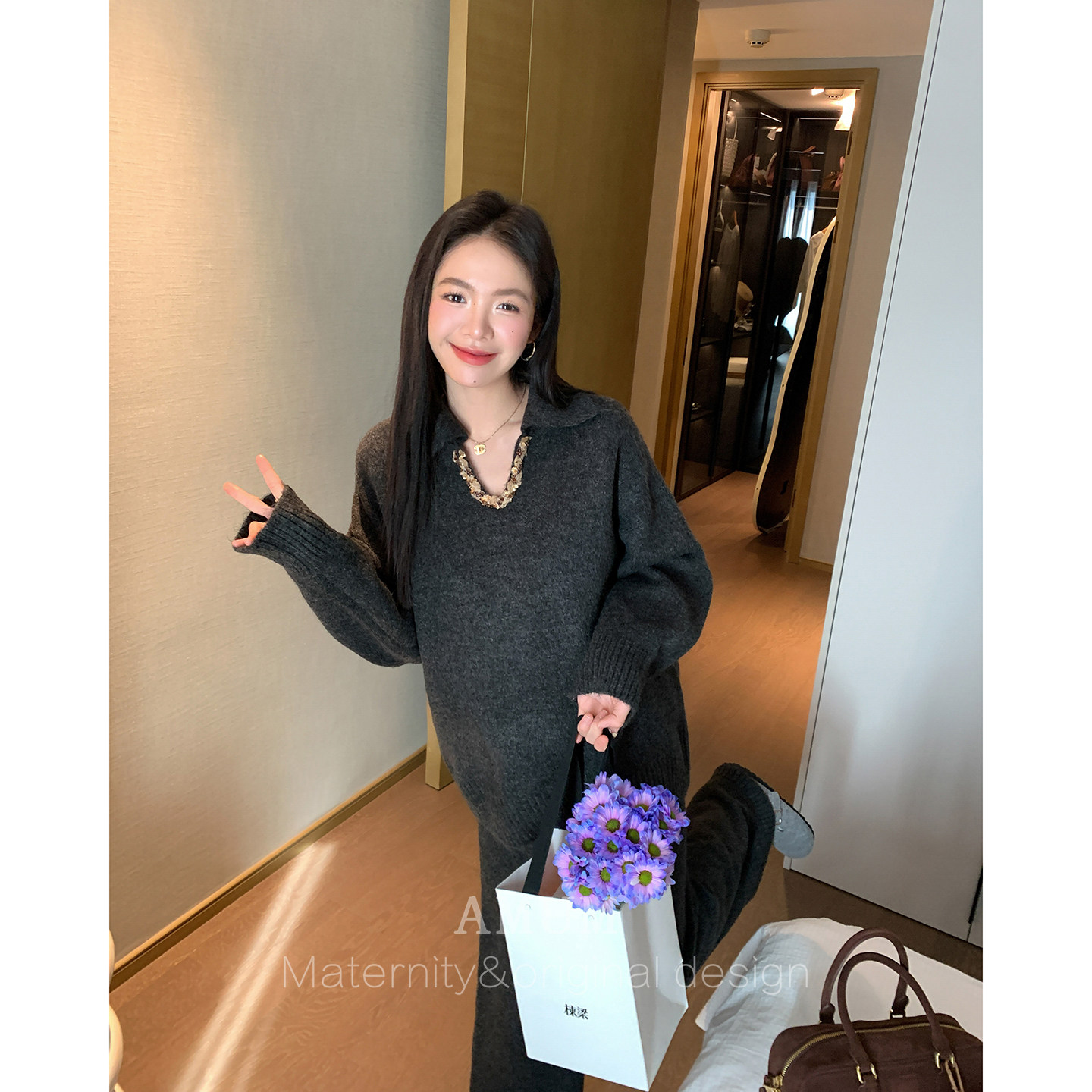 ◆AMUM孕妇装◆入冬典藏系列温暖上线!这套慵懒亮片V领毛衣搭配软糯针织阔腿裤两件套,专为孕期女性贴心设计。采用高品质软糯针织面料,亲肤透气,弹性十足,轻松包容不断变化的孕肚。V领设计修饰颈部线条,精致亮片点缀增添冬日闪耀感;宽松版型舒适不束缚,阔腿裤型显瘦又自在。无论是居家休闲还是外出聚会,都能展现优雅慵懒的孕妈魅力。AMUM以匠心工艺与时尚美学,陪伴每一位准妈妈度过温暖又美丽的孕期时光。这个冬天,让舒适与美丽同行。