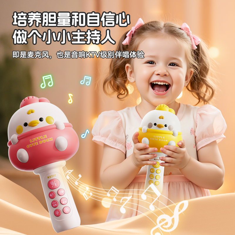 萌鸡小话筒麦克风是一款专为儿童设计的卡拉OK唱歌音响一体机,外形可爱萌趣,以卡通小鸡造型吸引孩子目光,适合3岁以上女孩使用。内置高品质扬声器与降噪麦克风,支持蓝牙连接、TF卡和U盘播放,可自由切换儿歌、故事、英文启蒙等内容,兼具娱乐与早教功能。一键录音、变声特效和灯光闪烁增添互动乐趣,激发孩子表达欲与音乐天赋。安全材质、圆润边角设计,使用更安心。无论是家庭聚会还是独自玩耍,都能让孩子尽情欢唱,是新年、生日或节日的理想礼物,陪伴孩子快乐成长,开启音乐启蒙之旅。