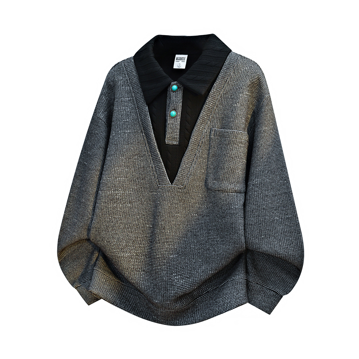 天花灰色假两件加绒卫衣男冬季美式翻领正肩长袖t恤内搭打底polo衫