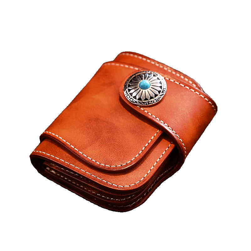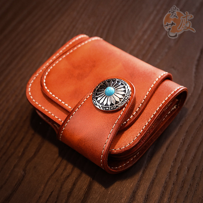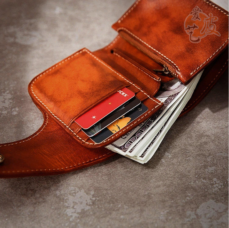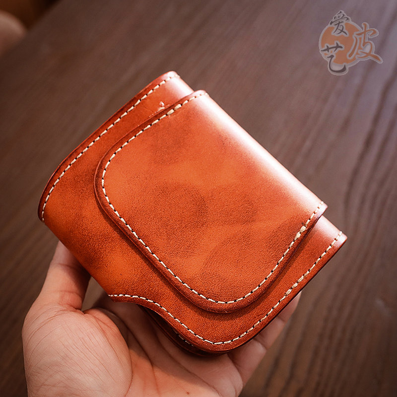 淘宝爱皮艺养牛钱包手工牛皮竖款搭扣复古风短款真皮财布卡位植鞣短夹