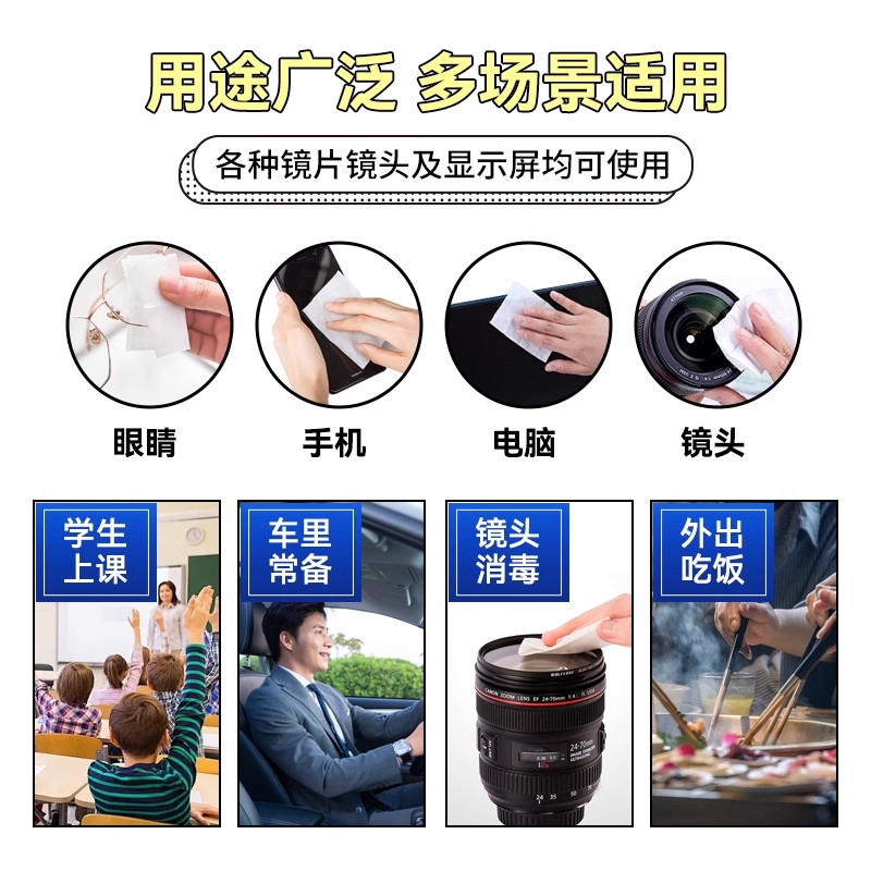 眼镜专用清洁湿巾,专为镜片与精密光学表面设计,采用无酒精、无腐蚀配方,温和不伤镀膜,有效去除油污、指纹与灰尘。独特防起雾技术,擦拭后形成保护膜,延缓镜片起雾,适合日常佩戴眼镜者及户外使用。湿巾质地柔软,不掉屑,可一次性擦拭眼镜、手机镜头、相机镜片等精密设备,清洁同时避免刮伤。独立包装,便携卫生,即取即用,是办公、出行、运动时的理想清洁伴侣。无论是树脂、玻璃还是防蓝光镜片,均能安全高效清洁,让视野更清晰,使用更安心。