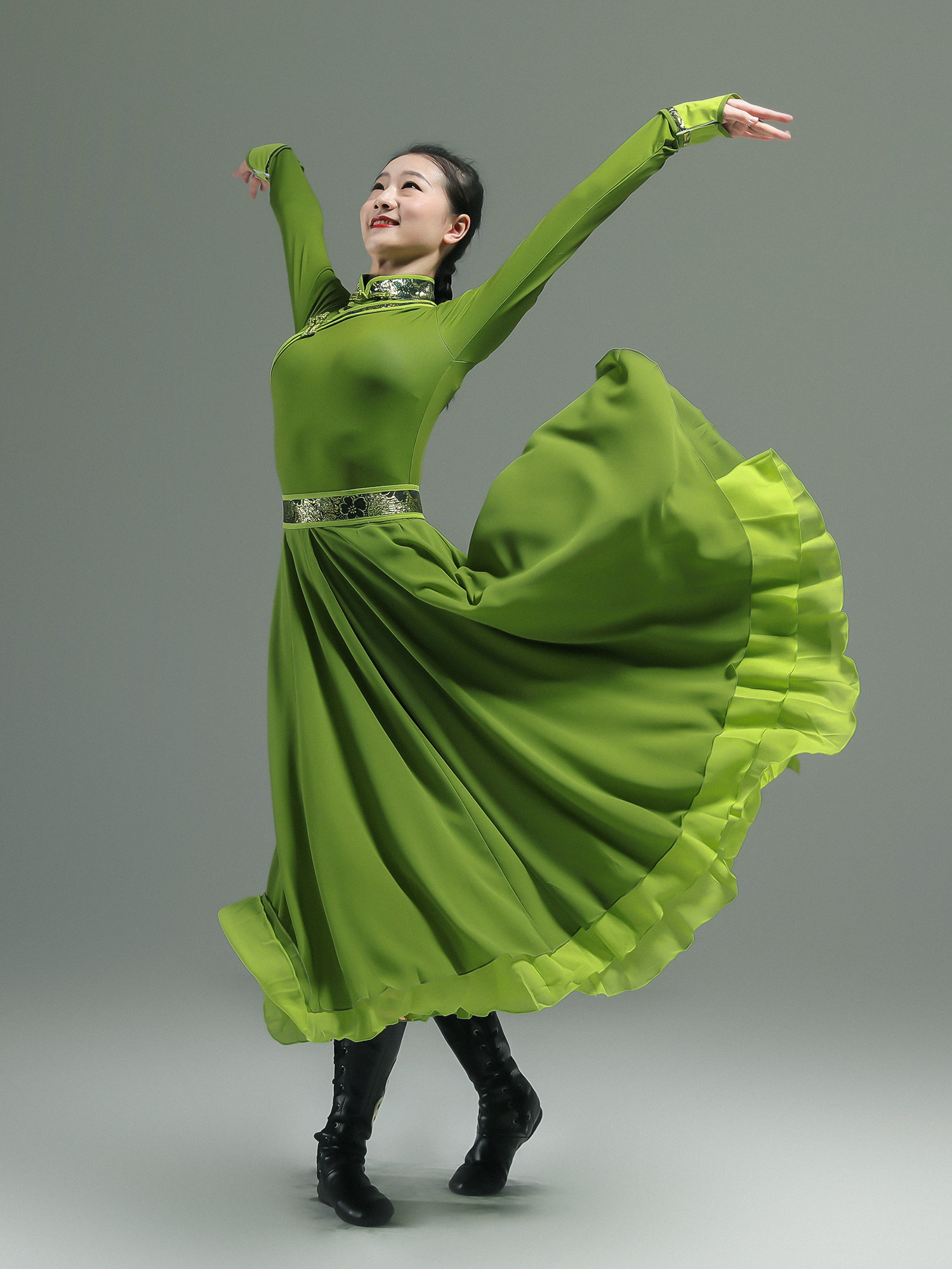 2023新款蒙古族舞蹈服装成人演出服,专为女性舞者及艺考生精心打造。采用优质面料,轻盈透气,贴合身形又不失飘逸感。经典民族元素与现代剪裁相结合,凸显蒙古族舞蹈的豪迈与柔美。大摆裙设计灵动飘逸,舞动时旋转如风,尽显草原风情。上衣刺绣精美,色彩浓郁,搭配传统盘扣与镶边,彰显民族文化底蕴。整体造型大气端庄,适合舞台表演、艺考练习及各类民族舞展示。无论是基本功训练还是正式演出,都能展现舞者优雅气质与专业水准,是蒙古族舞蹈爱好者的理想之选。