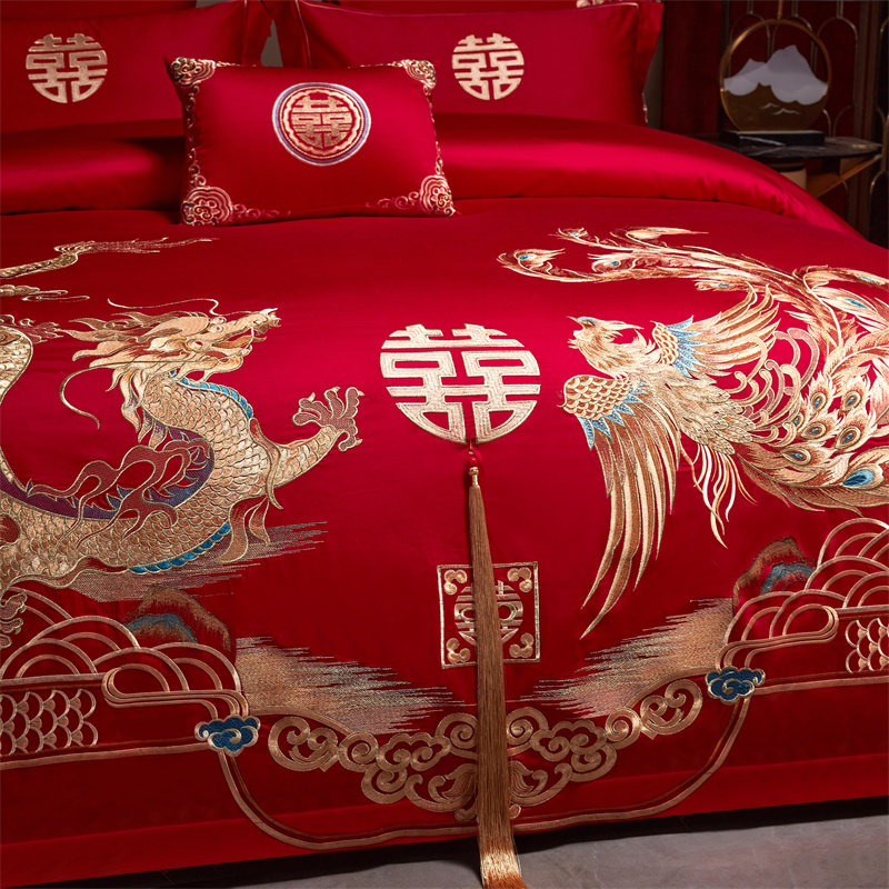 淘宝中式高档龙凤婚庆四件套大红色100S纯棉被套结婚送礼喜被床上用品
