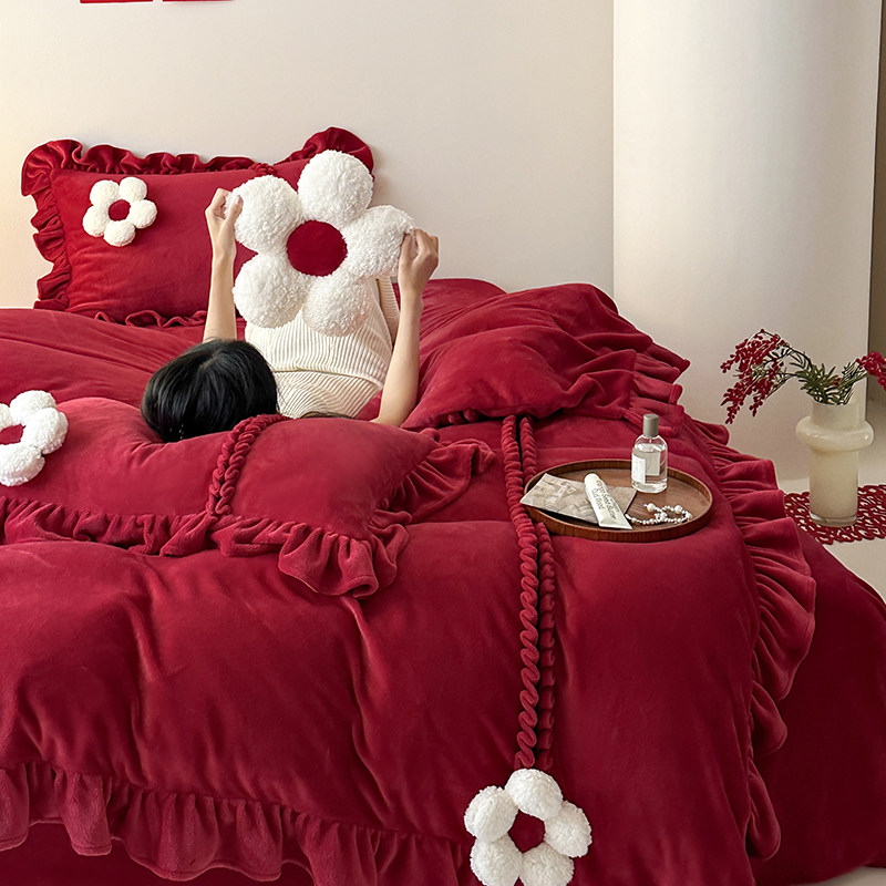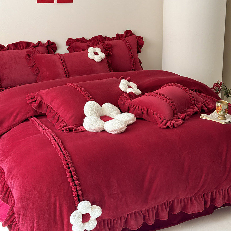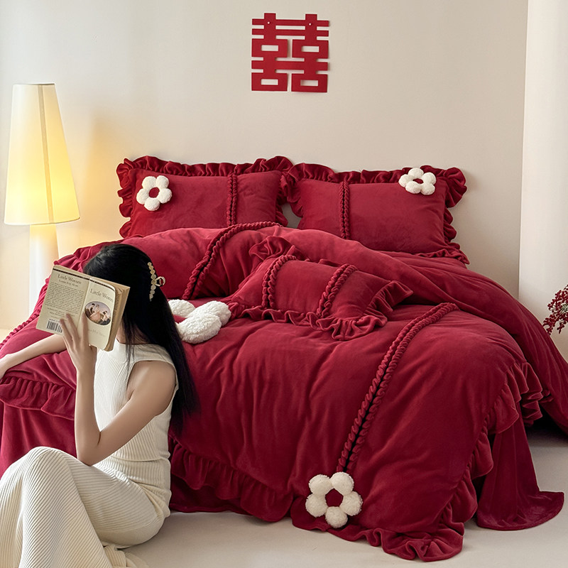 淘宝红色结婚用牛奶绒四件套轻奢高级感冬天加厚珊瑚绒被套法兰绒床品