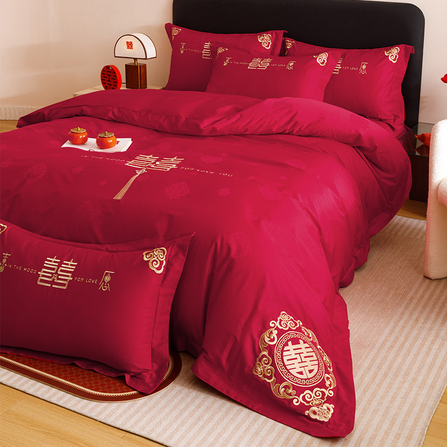 淘轻奢高级感全棉婚庆四件套纯棉结婚提花被套红色床单婚房陪嫁床品