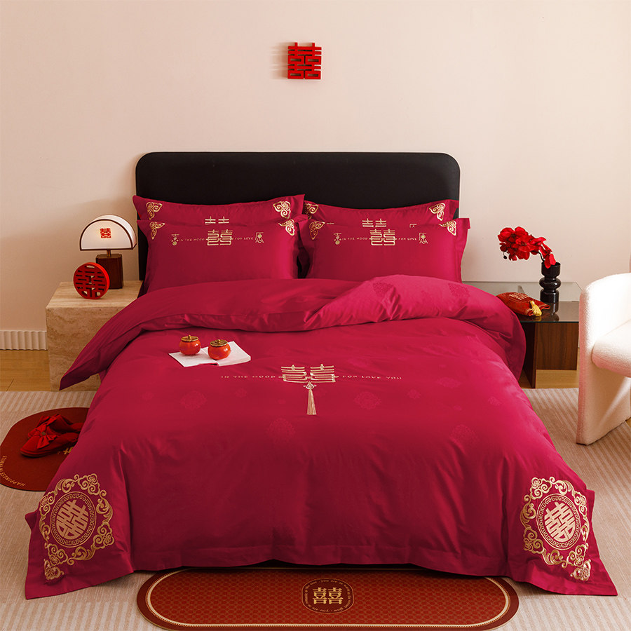 这款新中式婚庆床品四件套采用100S全棉高支高密面料,触感柔滑细腻,透气亲肤,带来舒适睡眠体验。整体以经典大红色为主调,寓意喜庆吉祥,融入传统双喜字刺绣工艺,针脚精致,立体饱满,彰显中式婚嫁文化的庄重与美好祝愿。包含被套、床单与床笠,搭配协调,实用美观。床笠设计贴合床垫,不易移位,使用更安心。无论是新婚布置还是婚房装饰,都能营造温馨浪漫的氛围,是传递祝福与美满婚姻的贴心之选,兼具传统韵味与现代品质,为爱巢增添一抹浓情蜜意。