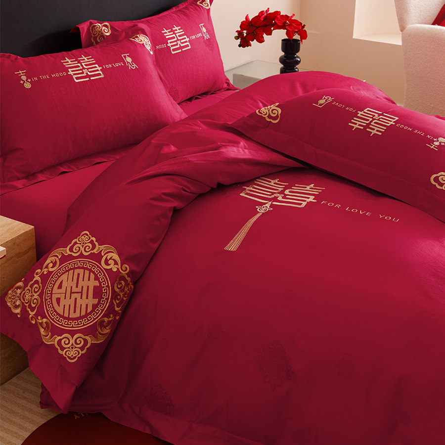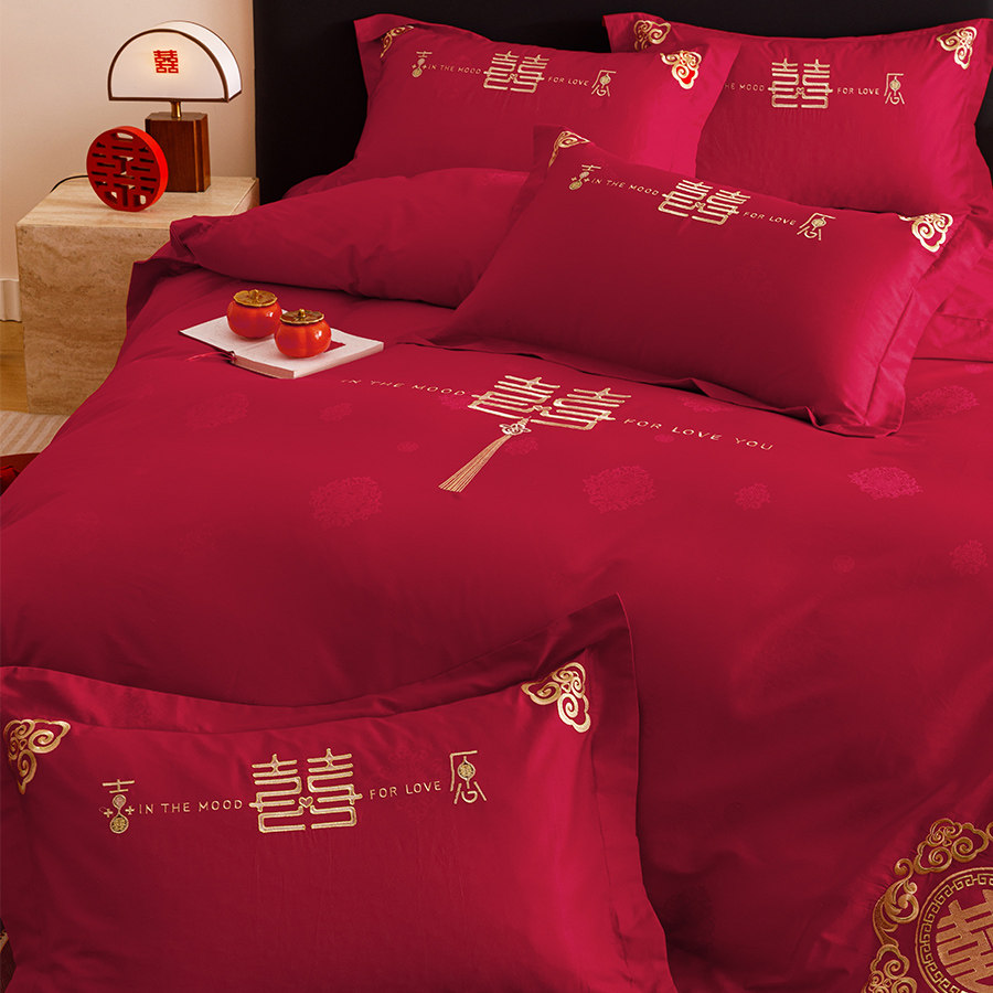 淘宝新中式婚庆床品四件套全棉100S双喜字刺绣大红色结婚被套床单床笠