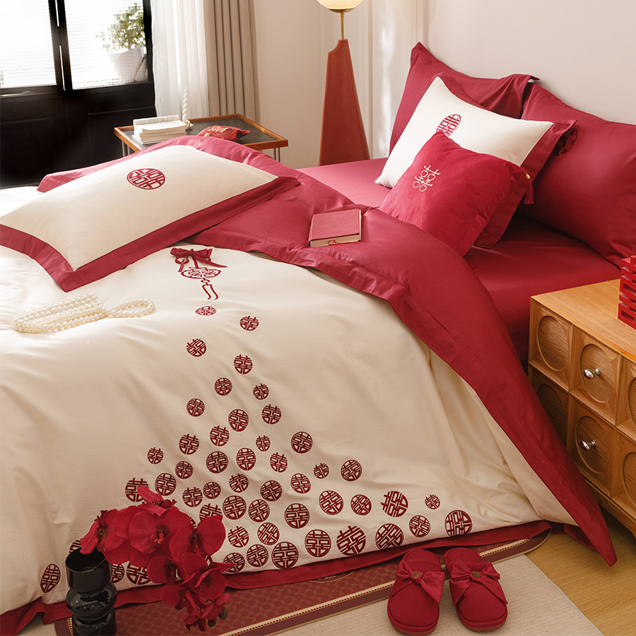 简约中式婚庆四件套全棉小爱心喜字刺绣红色结婚被套床单床笠款