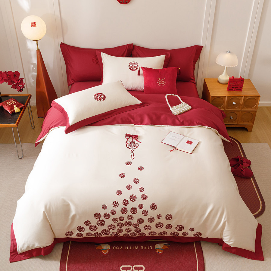 LANSWAY事柿如意婚庆被套全棉刺绣花红色结婚床单陪嫁床上四件套
