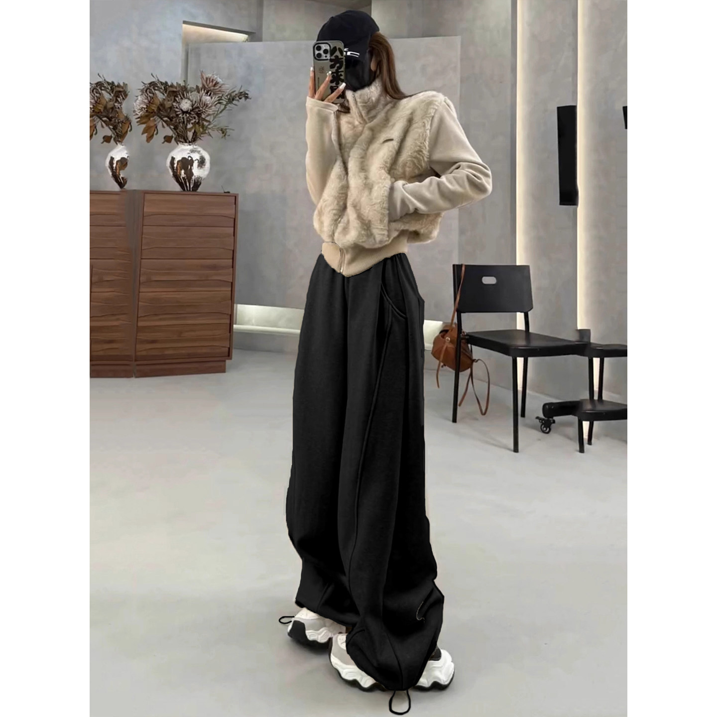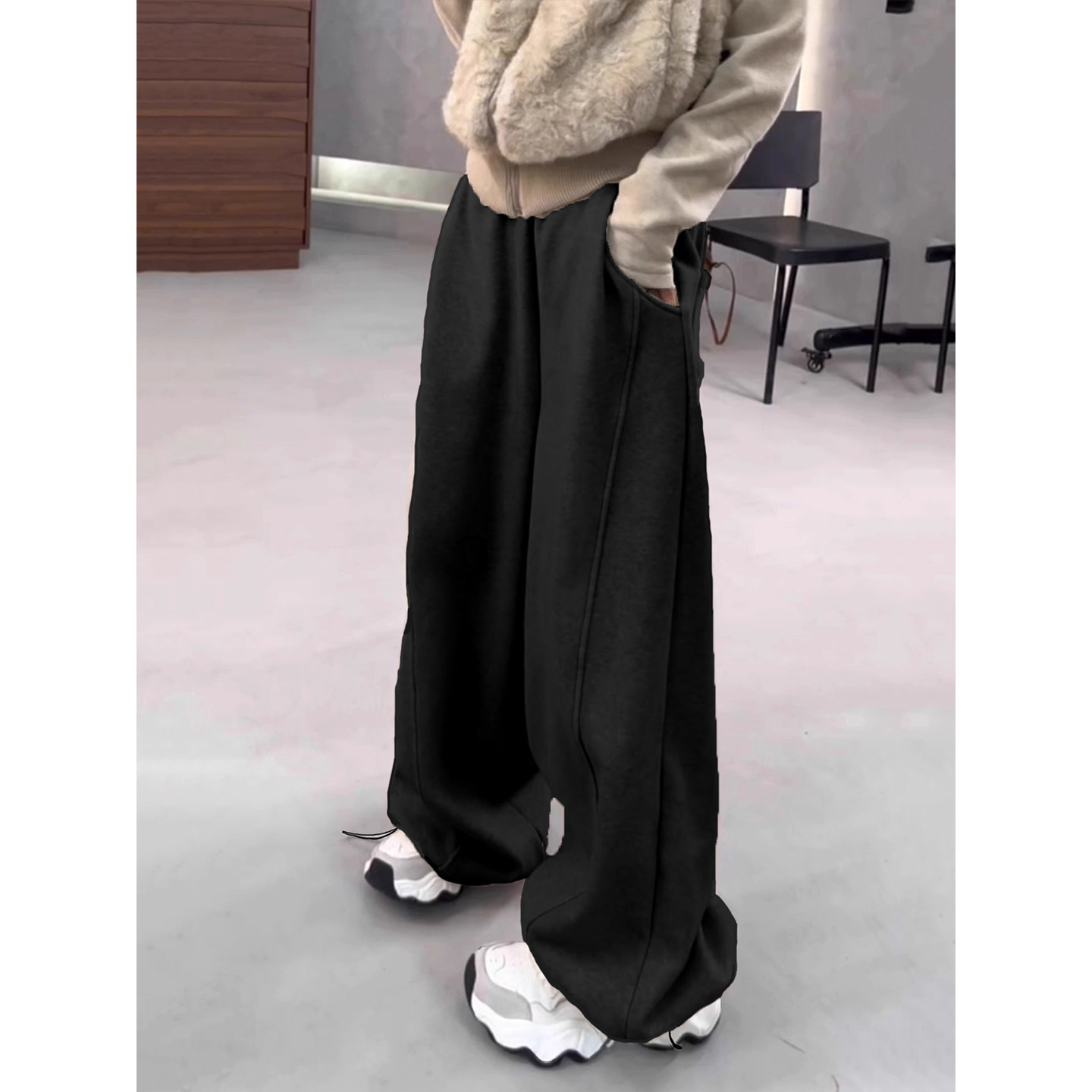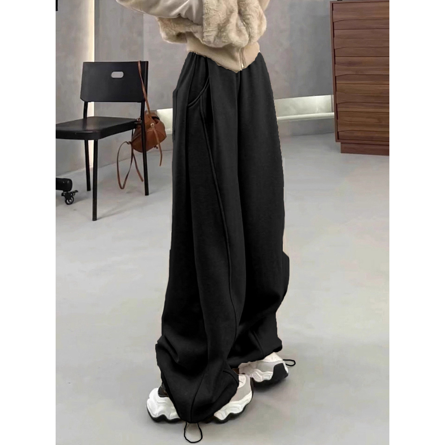 高个子专属的加长黑色运动阔腿卫裤,专为秋冬打造,采用加绒加厚面料,保暖舒适又不失轻盈。宽松慵懒的版型搭配垂坠感十足的面料,自然延伸腿部线条,轻松穿出高挑气质。拖地长度设计,既显腿长又自带随性时尚感,行走间飘逸灵动。高腰剪裁提升腰线,包容各种身材,搭配卫衣、毛衣或短款外套皆宜。无论是日常出街、居家休闲还是运动放松,这条阔腿卫裤都能带来极致舒适与时尚兼具的穿着体验,是秋冬衣橱不可或缺的百搭单品。
