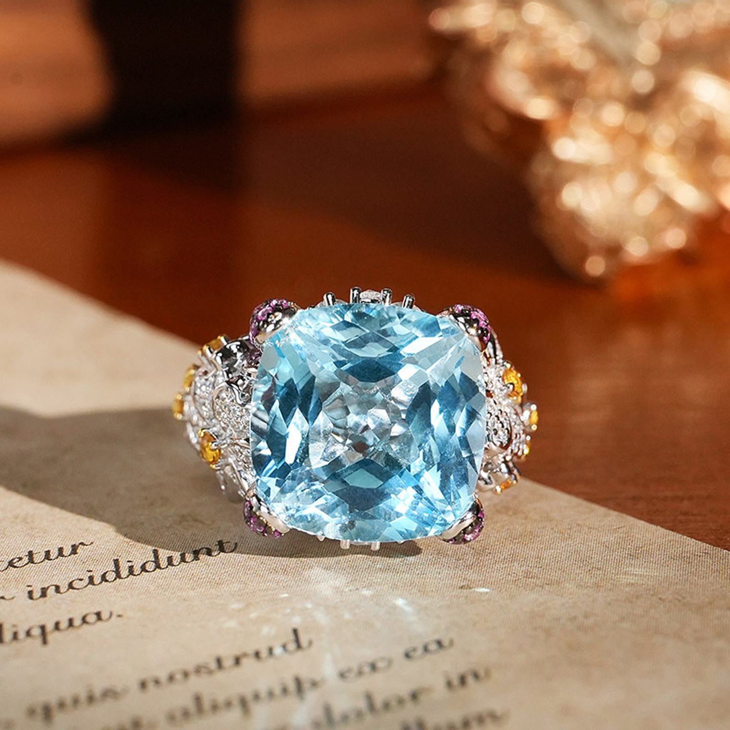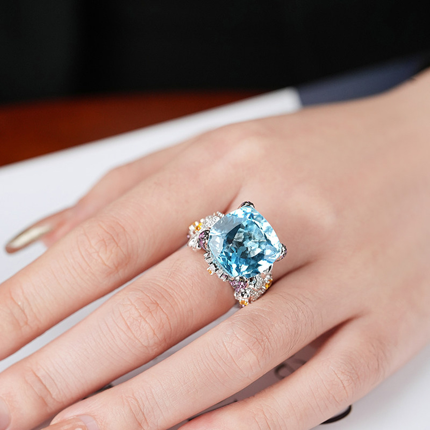 VISING21克拉花朵海蓝宝色托帕石“圣玛利亚BB蓝”大方戒指,以璀璨夺目的设计诠释优雅与奢华。主石采用21克拉顶级海蓝宝色调托帕石,呈现出清澈如圣玛利亚海水般的梦幻蓝色,色泽纯净通透,光芒流转间尽显高级质感。戒托以精致花朵造型镶嵌多颗闪耀小钻,宛如绽放于指尖的蓝花,浪漫而灵动。整体设计大气而不失柔美,适合日常佩戴或重要场合点缀。VISING匠心工艺确保每一处细节完美呈现,是彰显品味与个性的理想之选,为爱美的你增添一抹海洋般的宁静与高贵。