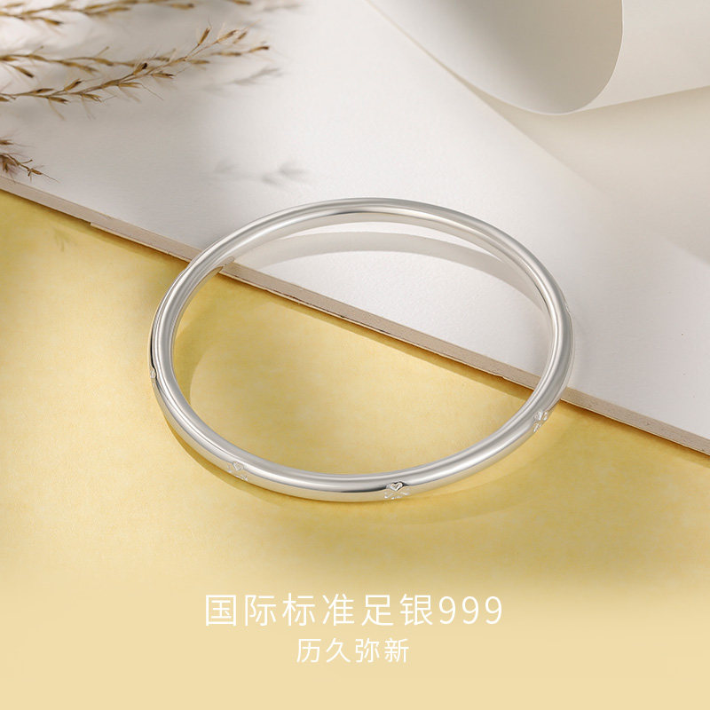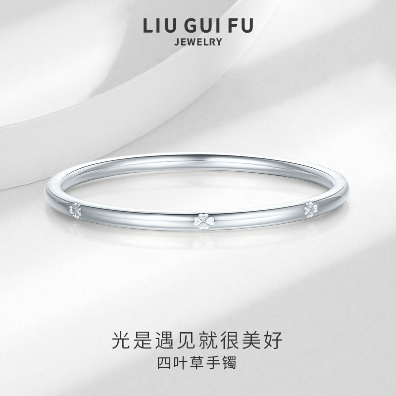 天猫六桂福珠宝999足银手饰经典四叶草手镯光面手环情侣送礼新年礼物