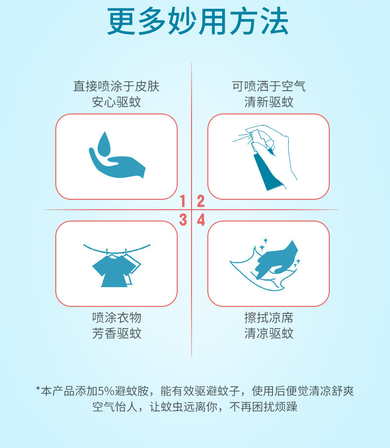 本品是一款清香型花香驱蚊喷雾,规格为5瓶装,每瓶75ml,另附赠5ml便携装花露水,方便随身携带。采用天然植物精华配方,气味清新怡人,留香持久,有效驱避蚊虫,适合居家、户外、旅行等多种场景使用。产品不含避蚊胺等有害成分,温和亲肤,适合成人及儿童(建议3岁以上)使用。喷头设计细腻均匀,喷洒舒适不黏腻,快速挥发不留痕。经权威检测认证,驱蚊效果显著,是夏季防蚊的理想选择。正品保障,品质可靠,让您远离蚊虫困扰,享受清爽宁静的夏日时光。