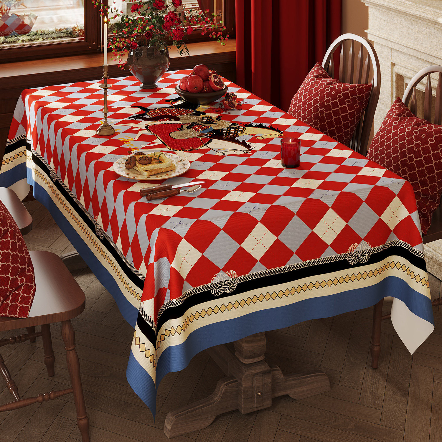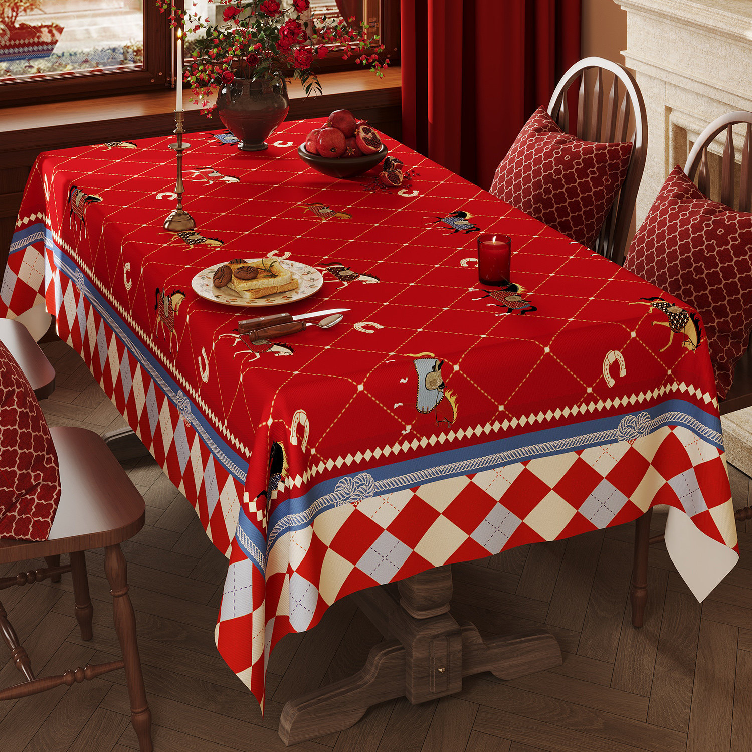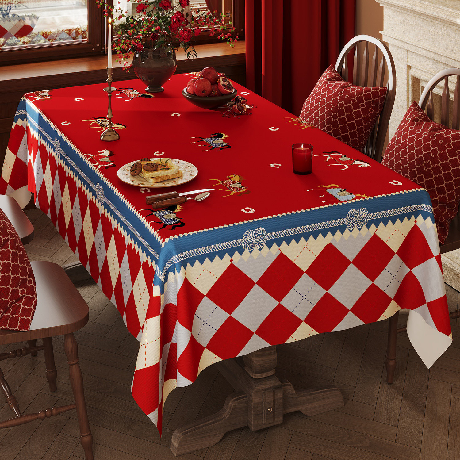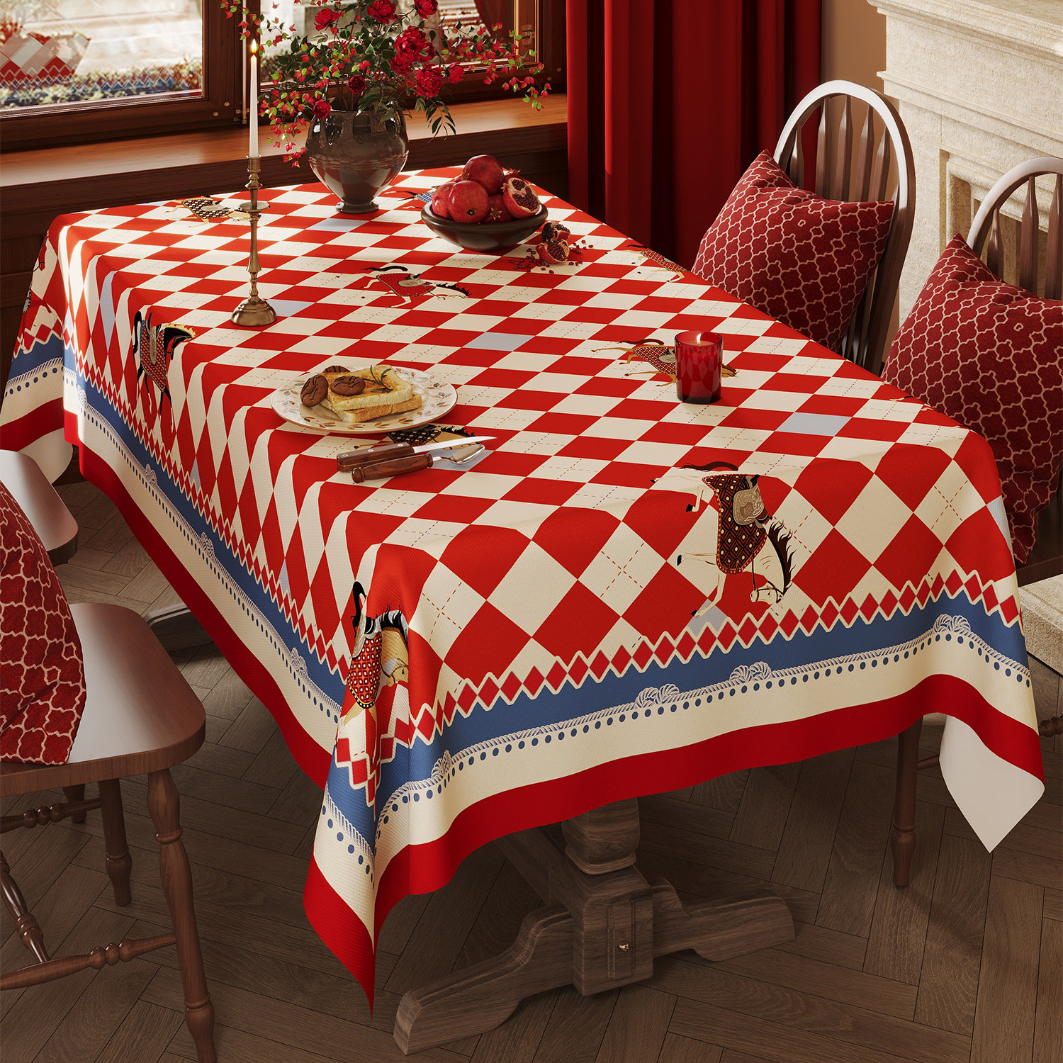 淘宝马年新年红白蓝菱格桌布轻奢复古小马图案餐桌布防水防油茶几台布