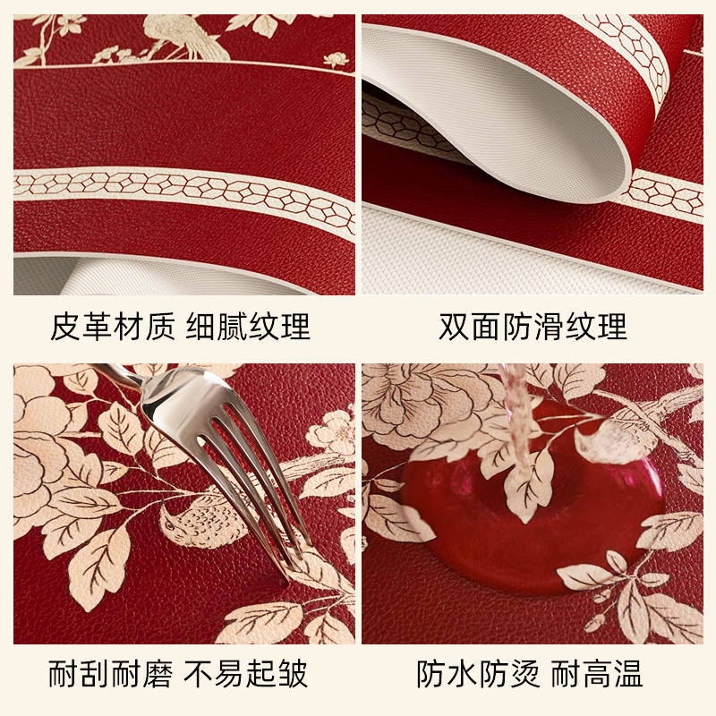孔雀呈祥春节防水防油免洗皮革餐桌垫,采用高品质环保皮革材质,方形设计简约大气,融合传统吉祥孔雀图案,寓意富贵吉祥、幸福美满,为新春佳节增添浓郁节日氛围。表面防水防油,轻松一抹即净,免洗设计省时省力;内里加厚隔热层,有效保护桌面免受高温损伤。同时具备防尘功能,日常使用更省心。无论是家庭聚餐、节日宴请还是日常用餐,都能彰显高雅品味,兼具实用性与装饰性,是提升餐桌美感的理想之选,让每一餐都充满仪式感与温馨气息。