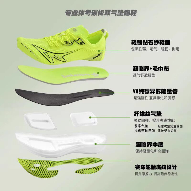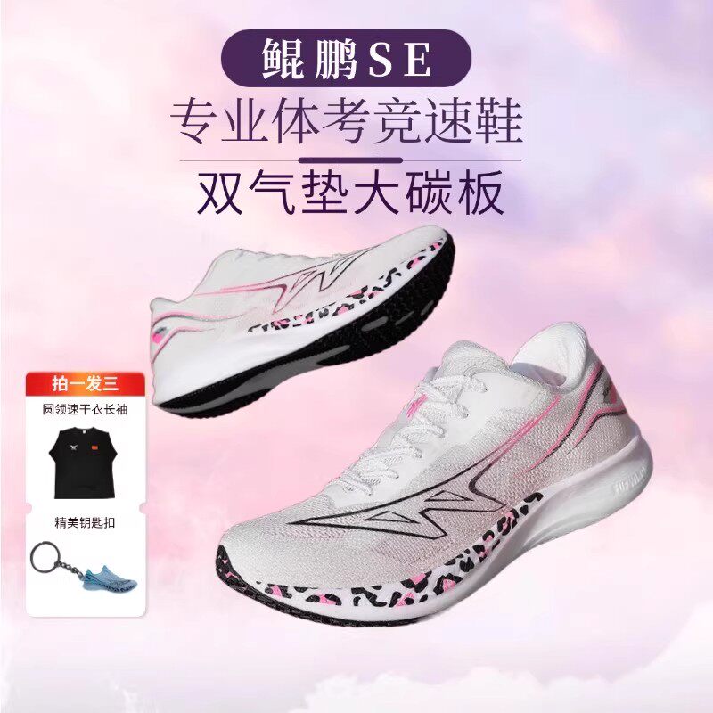 强风跑霸鲲鹏SE双气垫碳板田径竞速跑鞋,专为体育生及中学生体考体测训练打造。采用轻量化设计,搭载前后掌双气垫缓震系统,有效吸收冲击,提升回弹效率;内置全掌碳板,增强推进力,助力提速突破。鞋面使用透气工程网布,贴合脚型且排汗干爽,中底高弹泡棉提供持久能量反馈。抓地耐磨橡胶大底,适应多种跑道环境,保障训练安全。无论是800米、1000米耐力跑,还是短距离冲刺,鲲鹏SE都能提供卓越支撑与动力响应,是提升体测成绩的理想之选,助力每一位学子在跑道上 confidently 追逐梦想。