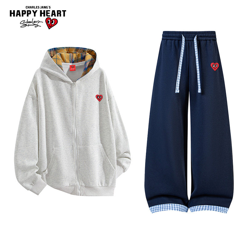 天猫查尔斯桃心 美式格纹开衫连帽卫衣套装男宽松直筒休闲长裤两件套