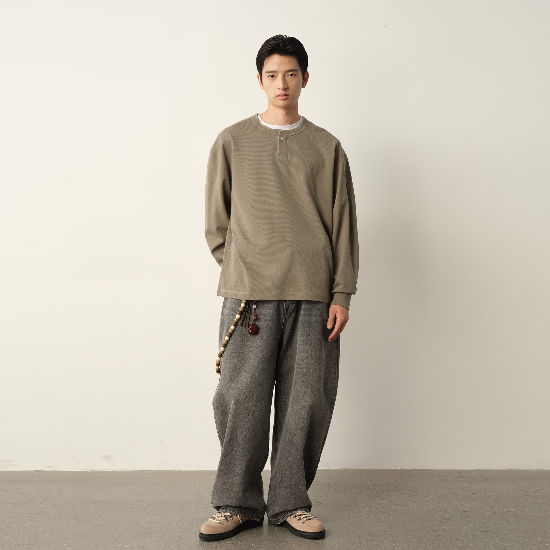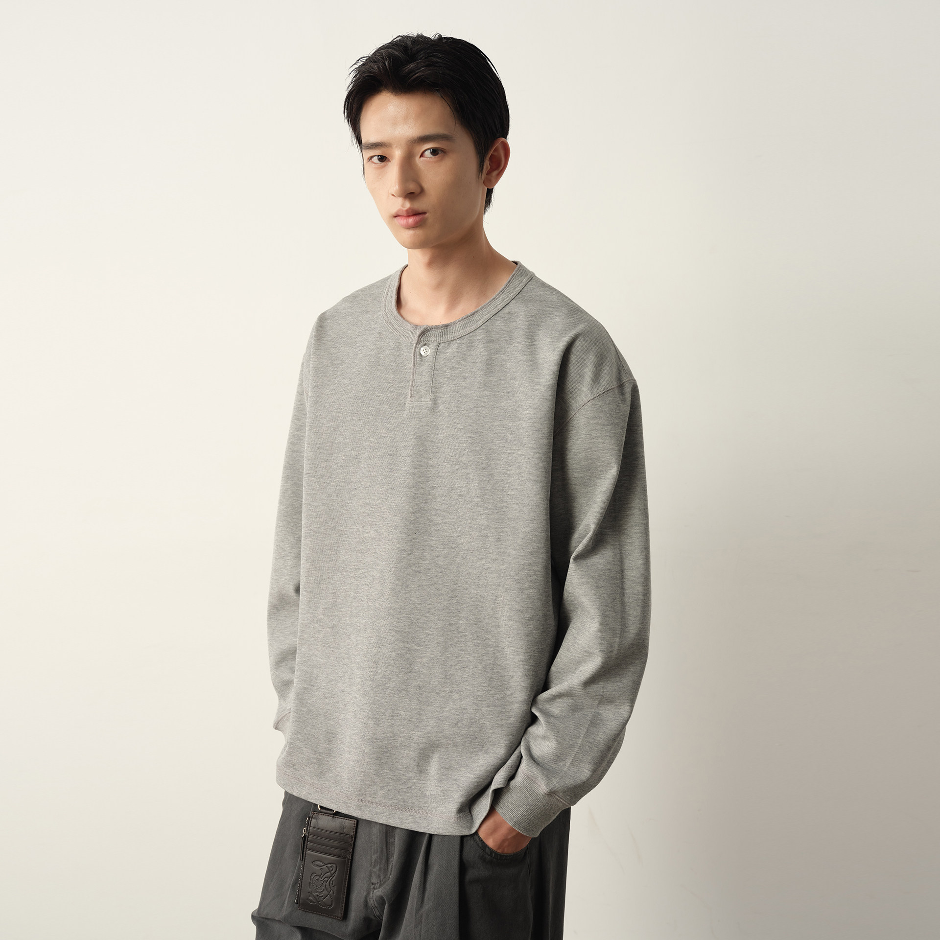 淘宝Vavu亨利领纹理感纽扣卫衣三针五线拼接设计长袖T恤基础打底衫男