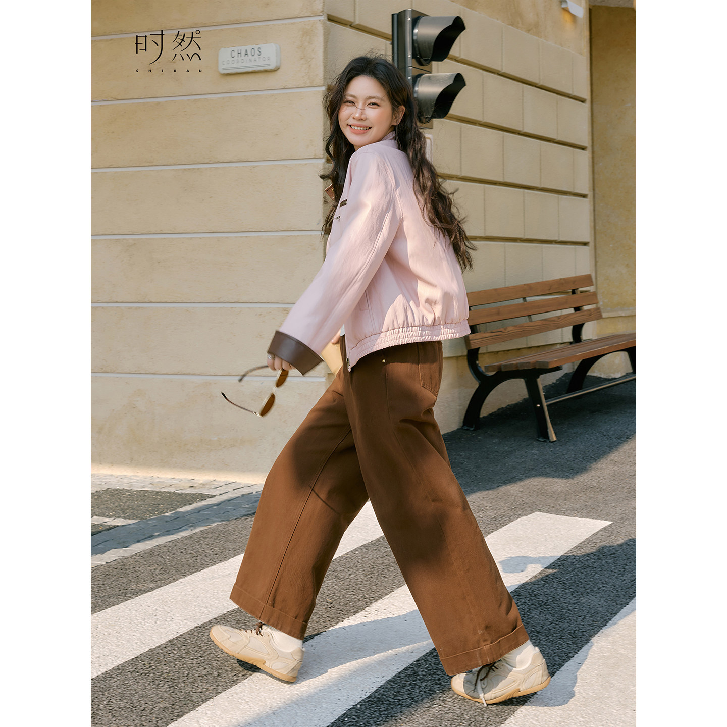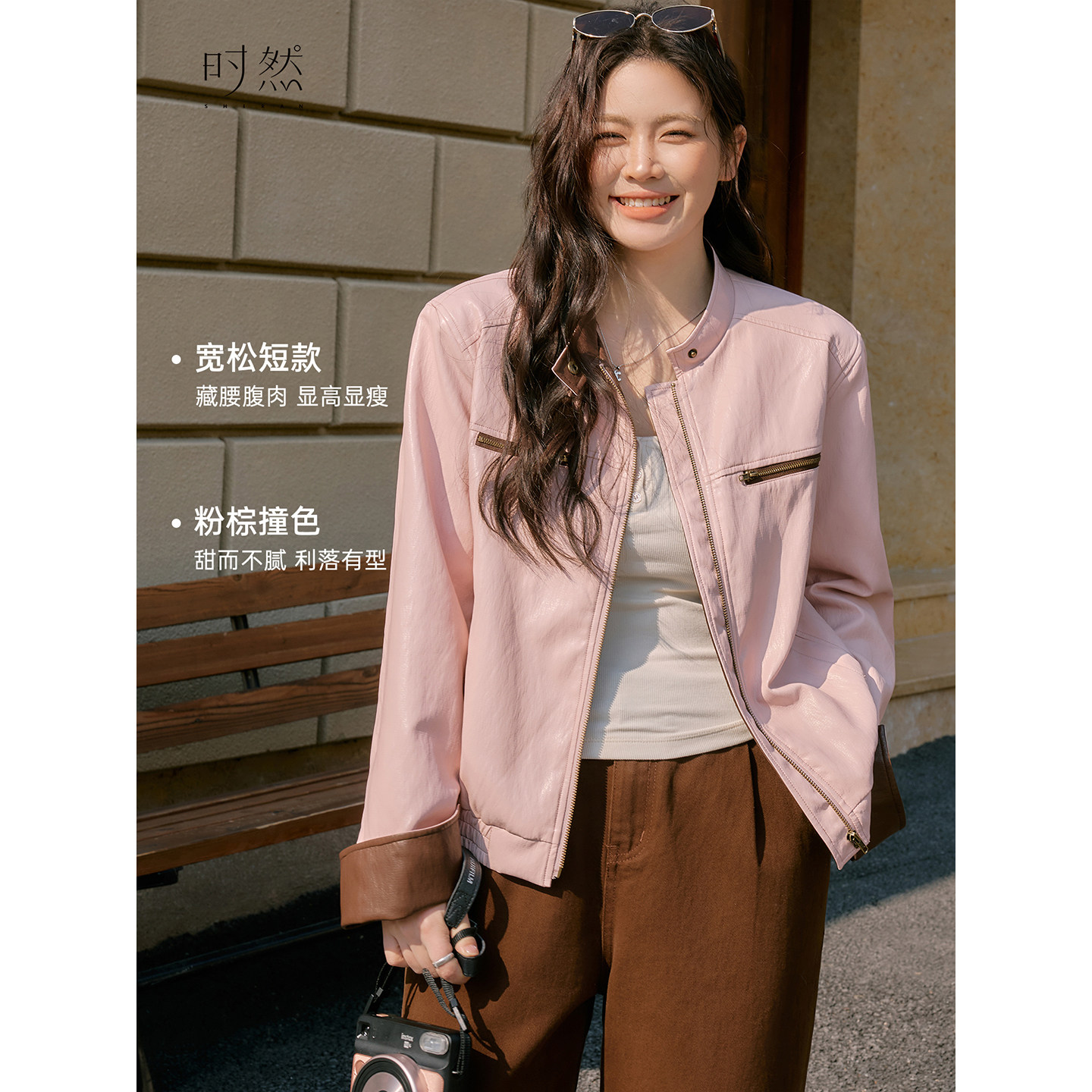 天猫时然大码粉色甜酷皮衣微胖mm女装撞色短款外套春季新品夹克宽松型