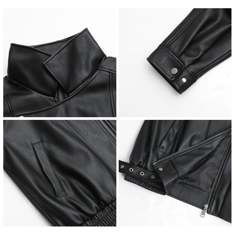 韩国chic秋季小众帅气立领抽绳设计宽松长袖机车服短款皮衣外套女