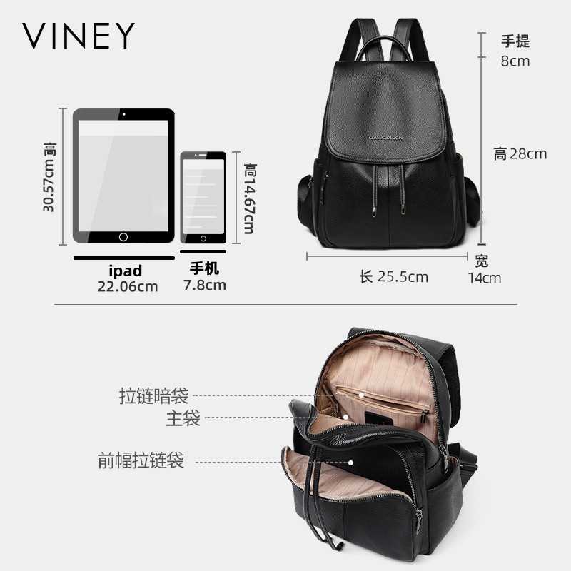 Viney 2026新款女包,以轻奢高级感重新定义女性背包美学。精选优质牛皮材质,触感细腻,纹理自然,彰显非凡品质。简约大气的设计融合实用与时尚,大容量主仓轻松容纳日常通勤、短途旅行所需物品,多隔层收纳井然有序。加宽肩带设计,背负舒适减压,适合长时间携带。金属配件精致耐用,细节之处尽显匠心。无论是职场通勤、周末出游还是日常出行,Viney双肩包都能完美搭配,展现优雅从容的摩登气质,是追求品质与风格女性的理想之选。
