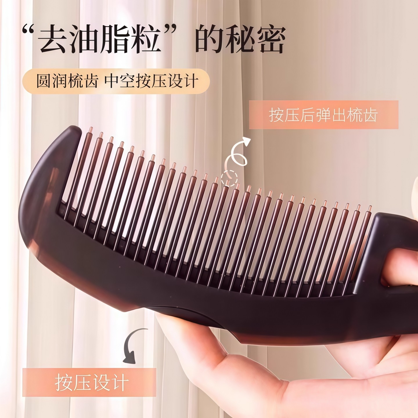 第三代能量梳——空心油头梳,集清洁、按摩、养护于一体,专为油性头皮设计。采用创新免洗头气囊技术,轻轻按压即可释放负离子能量,深入毛囊,有效分解油脂、清除皮屑,保持头皮清爽洁净。独特空心梳齿结构,减少拉扯,顺滑梳理同时促进血液循环,舒缓头部压力。材质安全亲肤,静电少,适用于日常护理及油头造型前预处理。无需水洗,随时随地焕发头皮活力,是追求高效护发人士的理想之选。长期使用可改善头皮环境,减少出油,令秀发更蓬松健康。