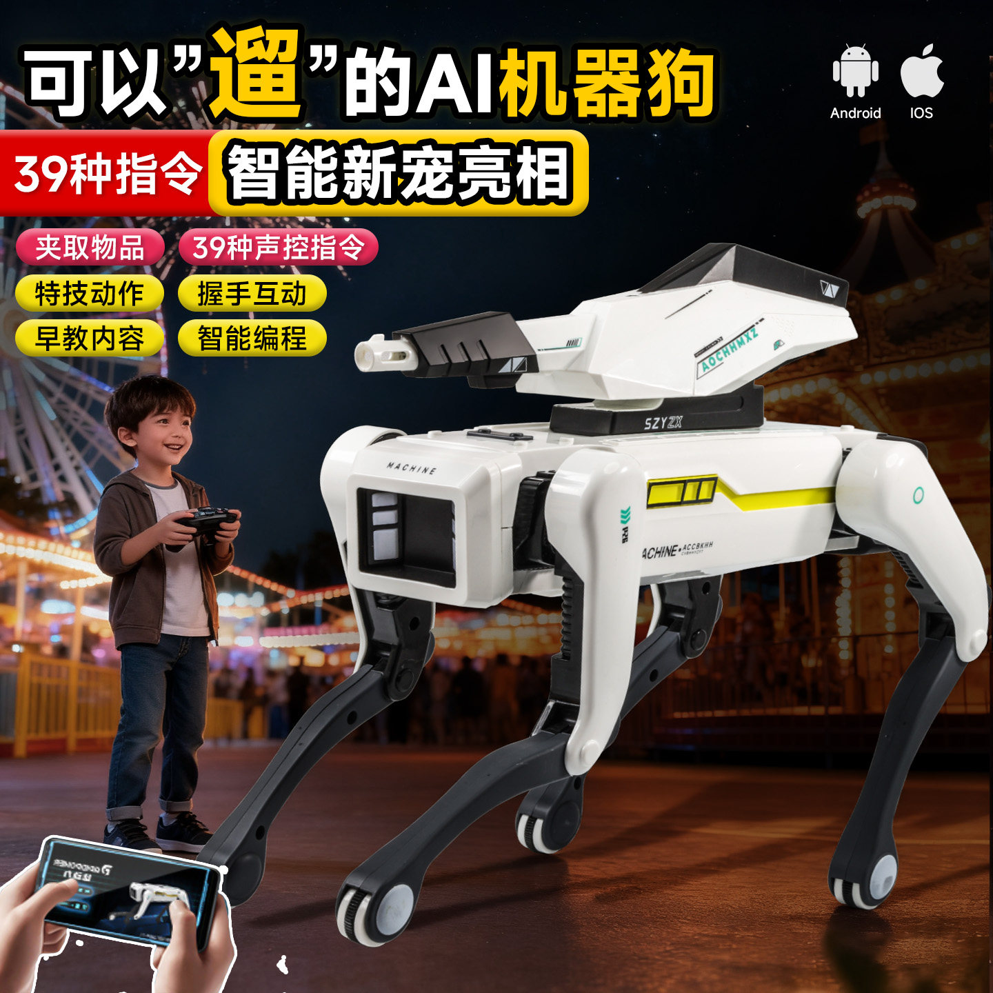 2026款AI机器狗是一款专为儿童设计的高科技智能遥控玩具,融合人工智能与编程启蒙功能,是送给男童的绝佳生日礼物。它具备语音识别、人脸识别和自主避障能力,可听懂指令、跟随主人互动,还能通过简单编程实现动作定制,激发孩子逻辑思维与创造力。机身采用环保材质,安全可靠,支持APP遥控与手势控制,动作灵活逼真,可跳舞、握手、翻滚,陪伴孩子快乐成长。内置丰富故事、儿歌与益智游戏,寓教于乐,让科技启蒙从玩中学。这款智能机械狗不仅是玩伴,更是孩子探索AI世界的启蒙老师,开启未来科技之旅。