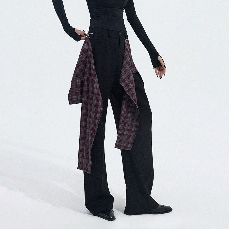 淘宝ourhour 黑色可拆卸 浆果红格衬衫裙帘宽松弯刀西裤 女设计感长裤