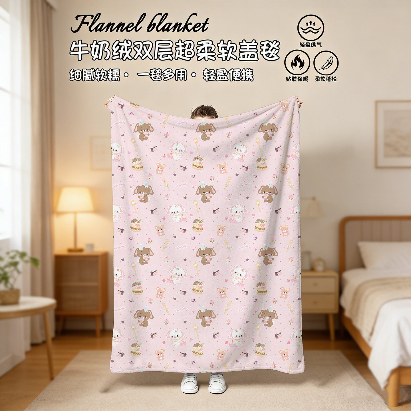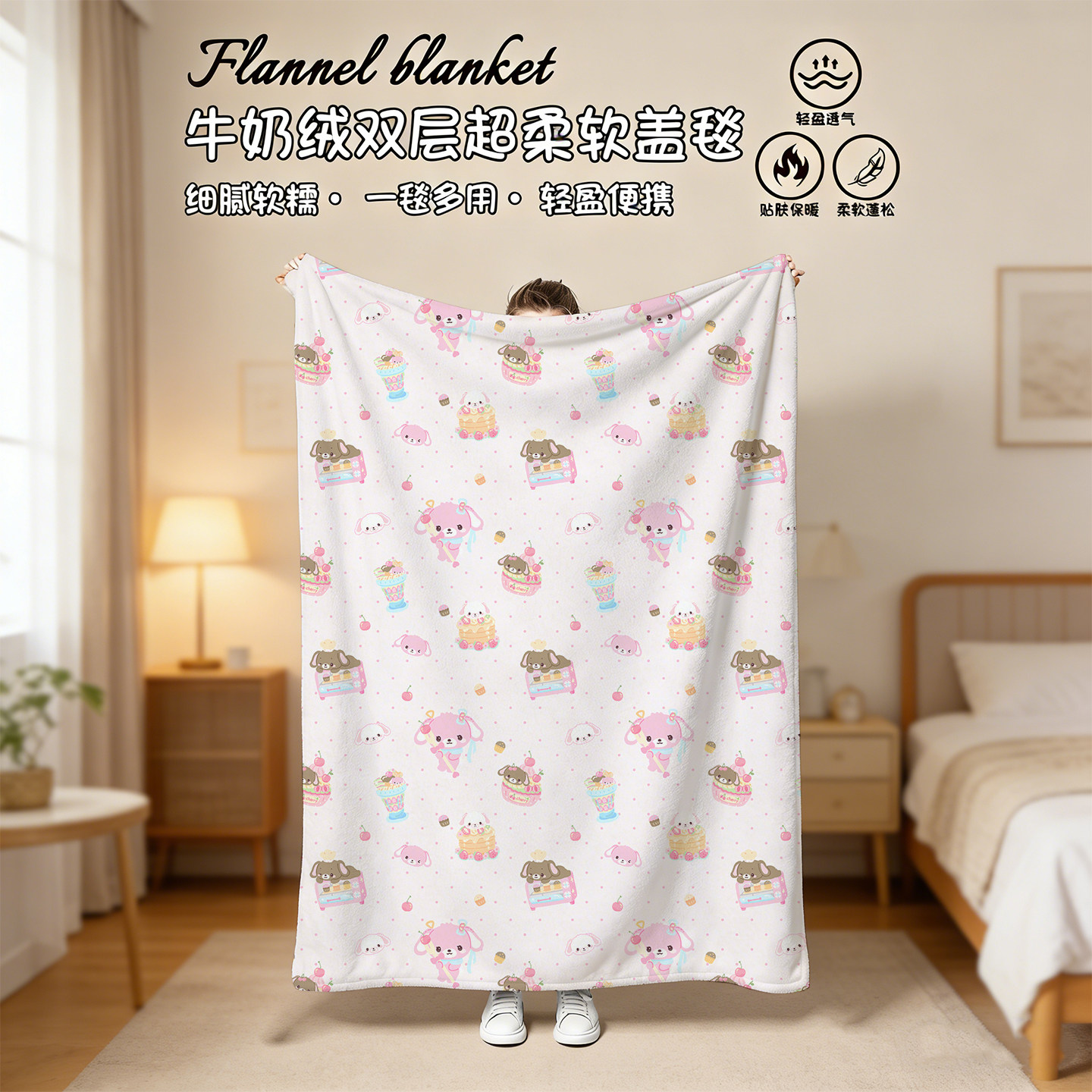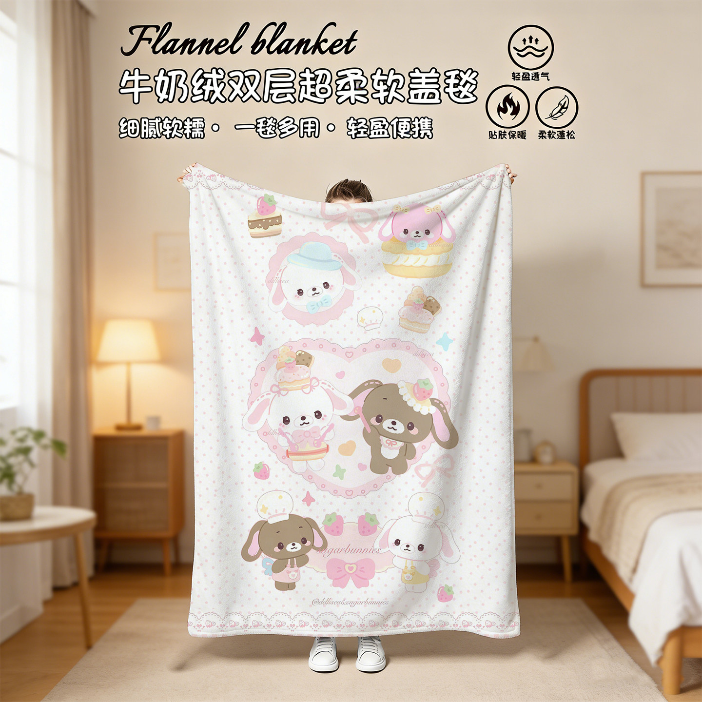 甜点兔午睡毯,柔软亲肤,是办公室、居家午休的理想伴侣。采用优质短毛绒材质,触感细腻,保暖透气,秋冬使用温暖舒适。尺寸适中,既可作为沙发毯、空调被,也能变身学生披肩,一毯多用,轻便易携。可爱的甜点兔图案设计,萌趣十足,为日常增添温馨与治愈感。无论是伏案小憩、午间休息,还是居家追剧,都能带来贴心呵护。折叠后小巧不占空间,方便收纳与携带,是学生、上班族提升生活幸福感的小物之选。让每一刻休憩都如甜点般甜蜜惬意。