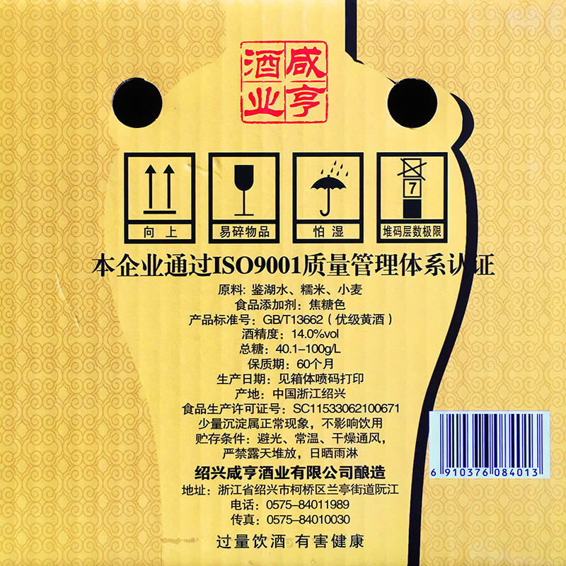 天咸亨黄酒三年原酿绍兴黄酒500ml*6瓶礼盒14度半甜型糯米花雕酒