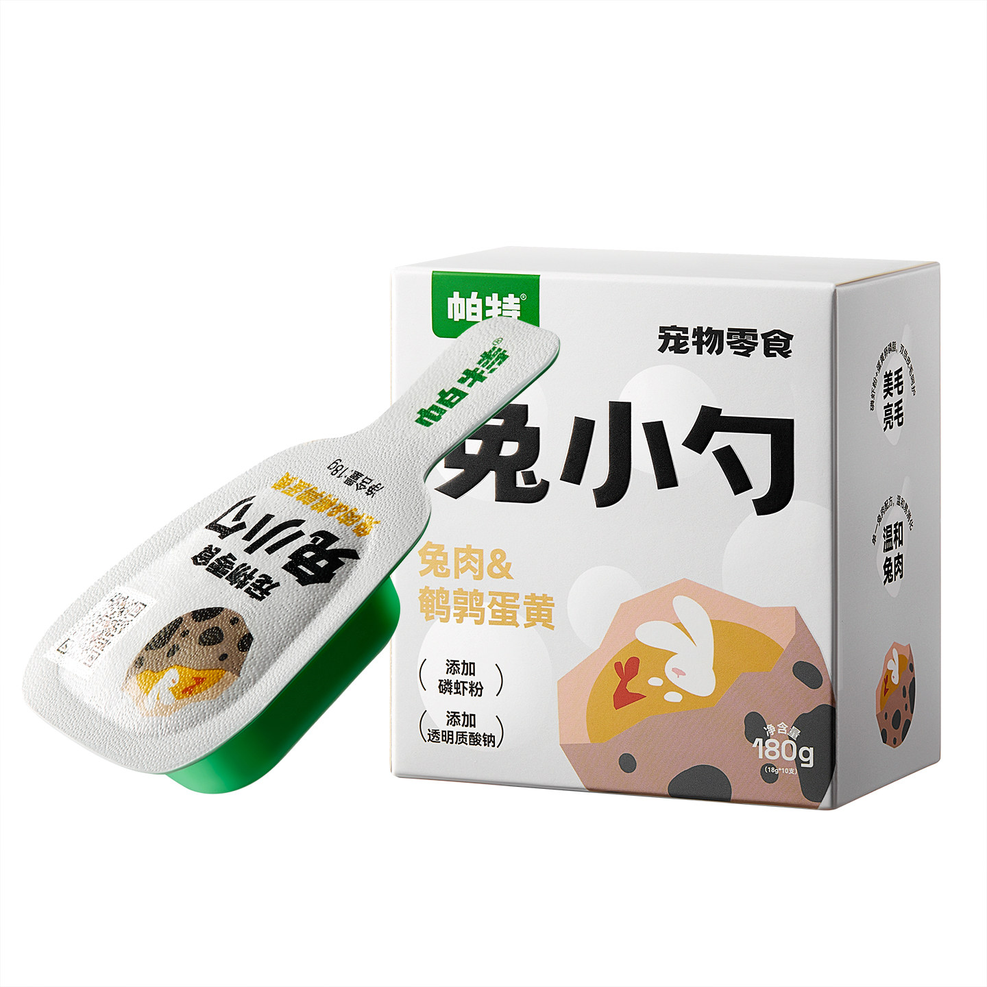 帕特兔小勺零食餐盒是一款专为猫咪设计的优质湿粮,精选新鲜兔肉为主料,富含高蛋白与天然营养,助力猫咪健康成长。特别添加排毛成分,帮助猫咪温和排出体内毛球,维护肠胃健康;同时搭配美毛配方,滋养毛发,令被毛柔顺亮泽。产品注重泌尿系统护理,低镁配比并促进水分摄入,有效预防泌尿问题。开盖即食,质地细腻,适口性佳,既是营养主食,也可作为日常补水零食。帕特坚持无添加理念,不含诱食剂、防腐剂,让猫咪吃得安心,主人更放心。是关爱猫咪健康饮食的理想选择。