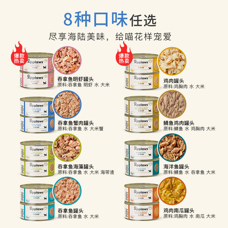天猫Applaws爱普士猫罐头70g*33罐进口猫咪零食营养补水湿粮肉汤罐头