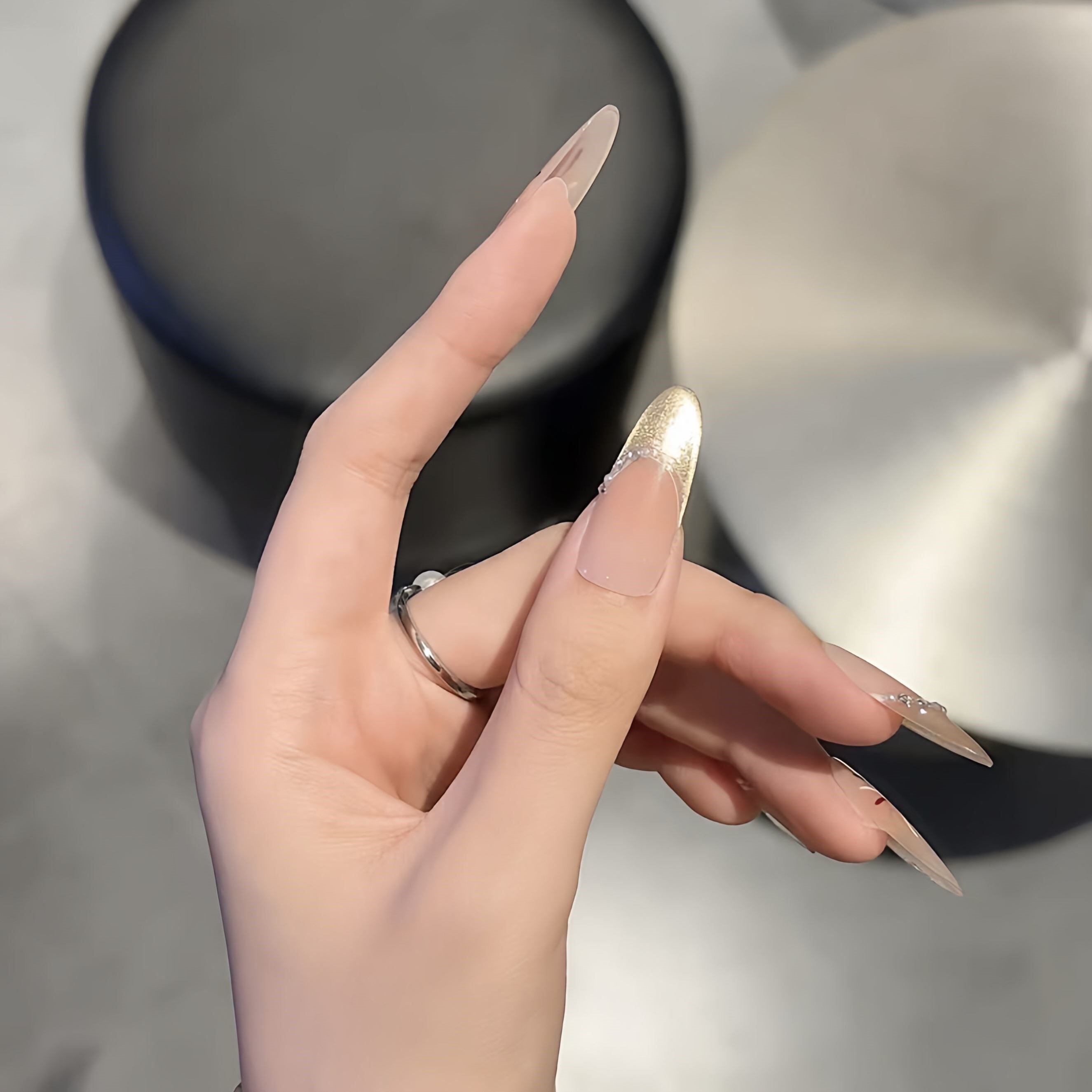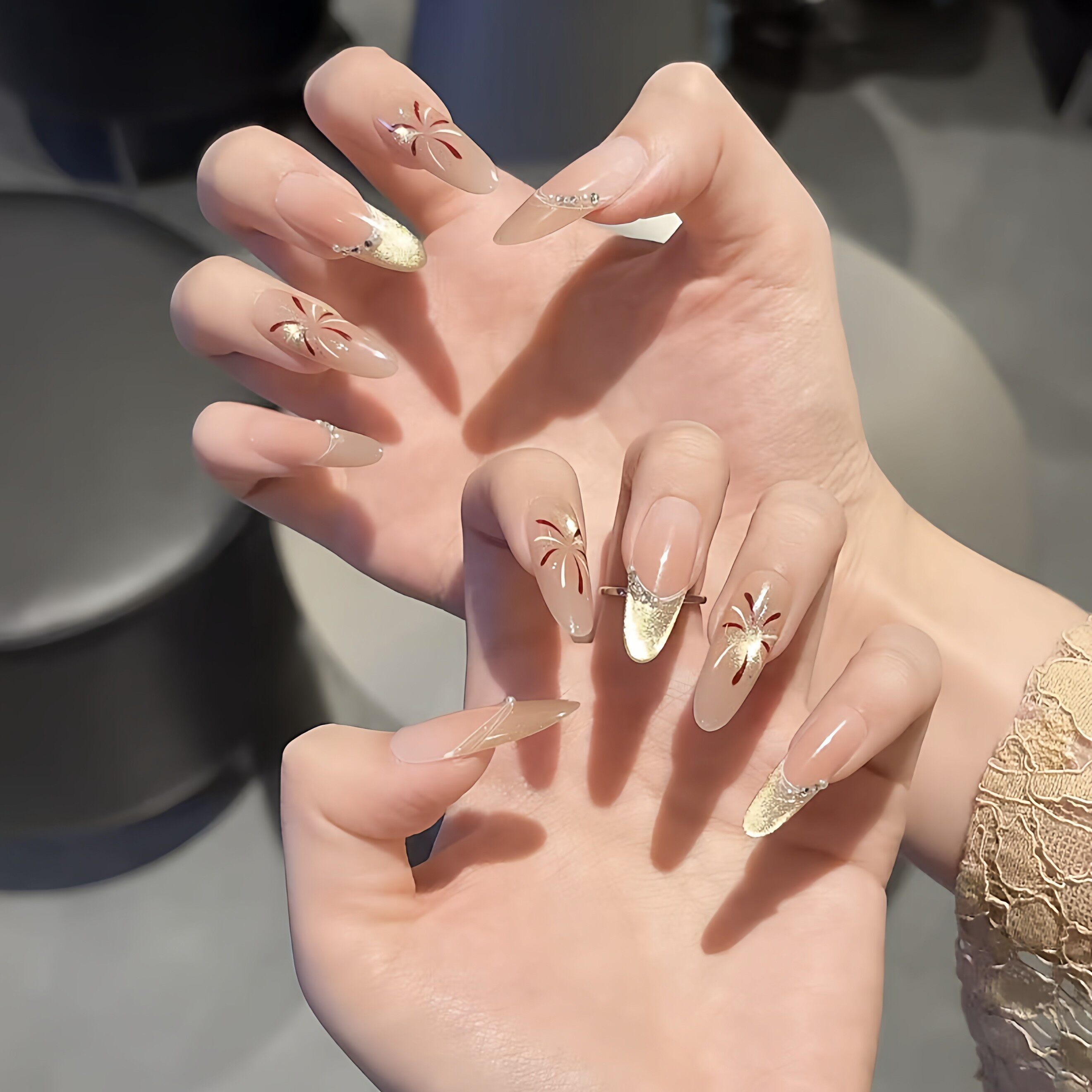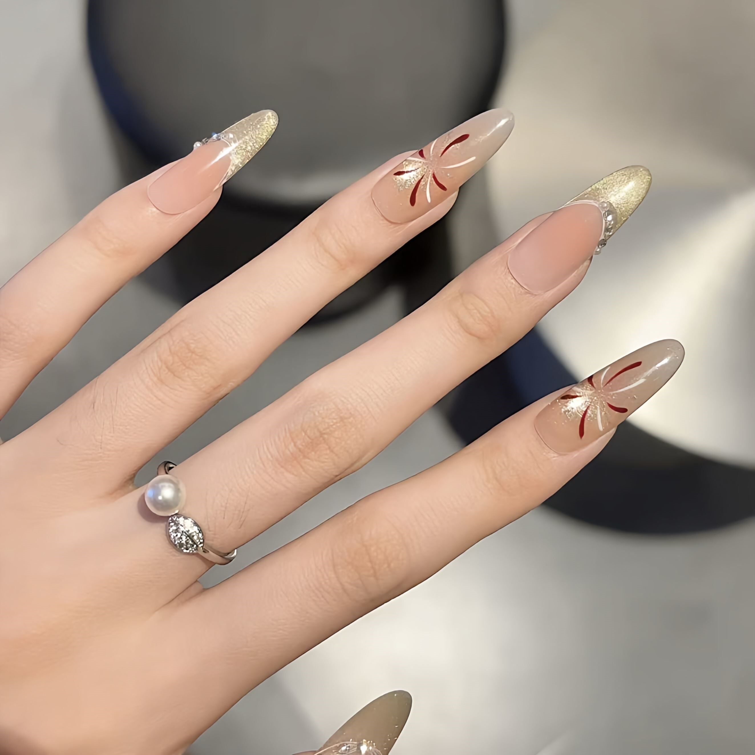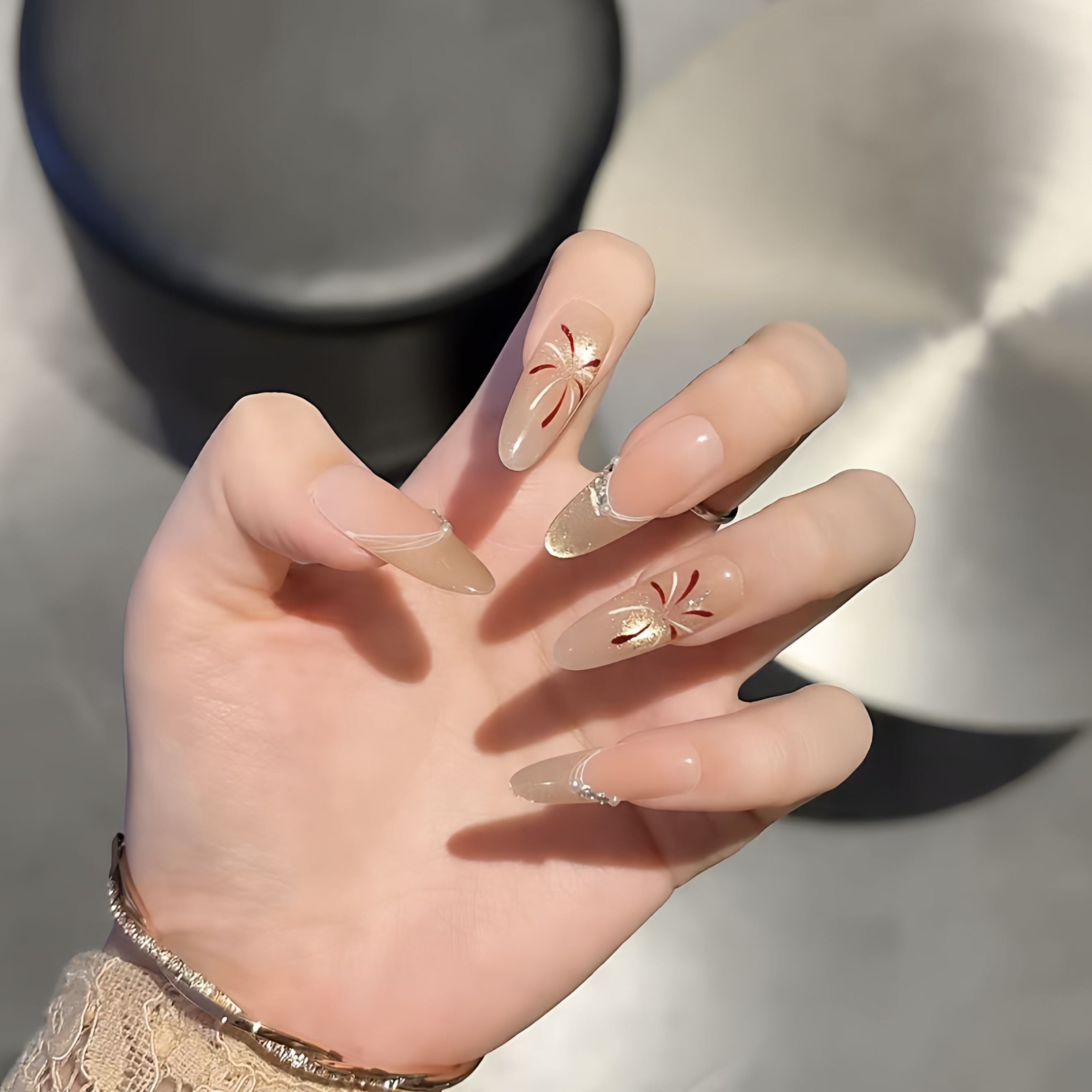 这款新年烟花穿戴甲,采用长椭圆甲型设计,贴合指尖更显纤长显瘦,尤其适合亚洲女性手型。纯手工打造,细节精致,融合猫眼渐变工艺,在不同光线下呈现梦幻光晕,宛如夜空绽放的烟花,浪漫又吸睛。整体色调以银白、香槟金与淡紫渐变为主,低调中透出高级感,显白效果出众。仙女风设计搭配细腻闪粉,举手投足间尽显优雅与灵动,无论是新年聚会、约会还是日常通勤,都能轻松驾驭,瞬间提升整体造型质感。无需美甲店,轻松粘贴即可拥有 salon 级美甲体验,是新年必备时尚单品。