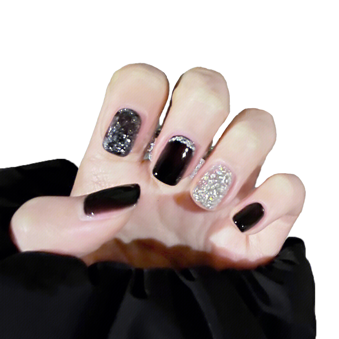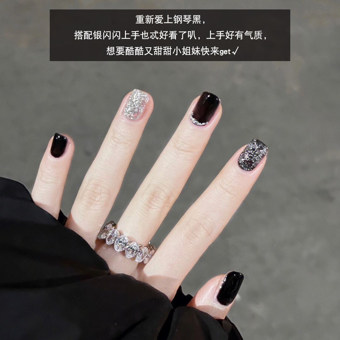 淘宝淳贵人手工制作美甲成品黑色系银粉假指甲贴片 可穿戴式光疗甲片