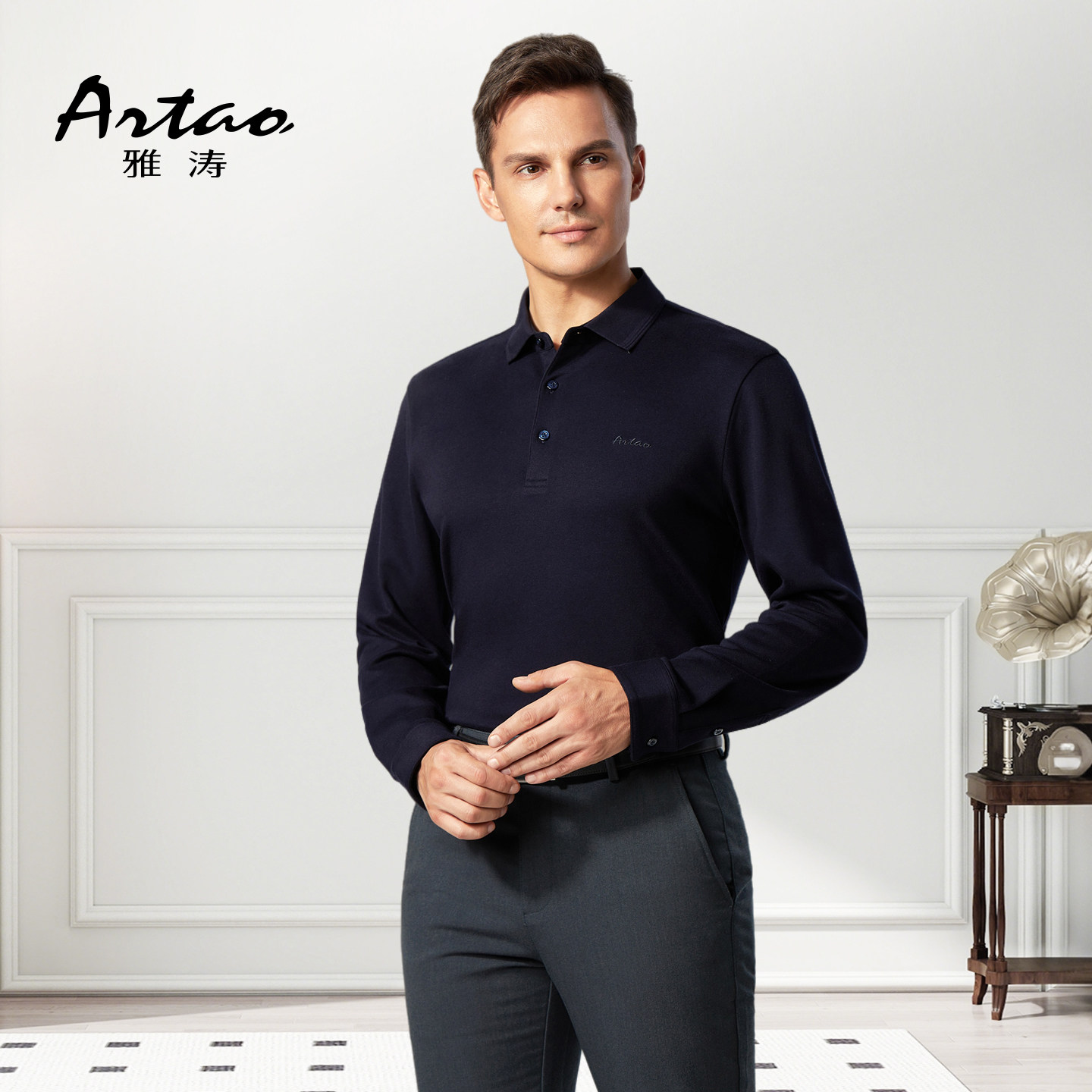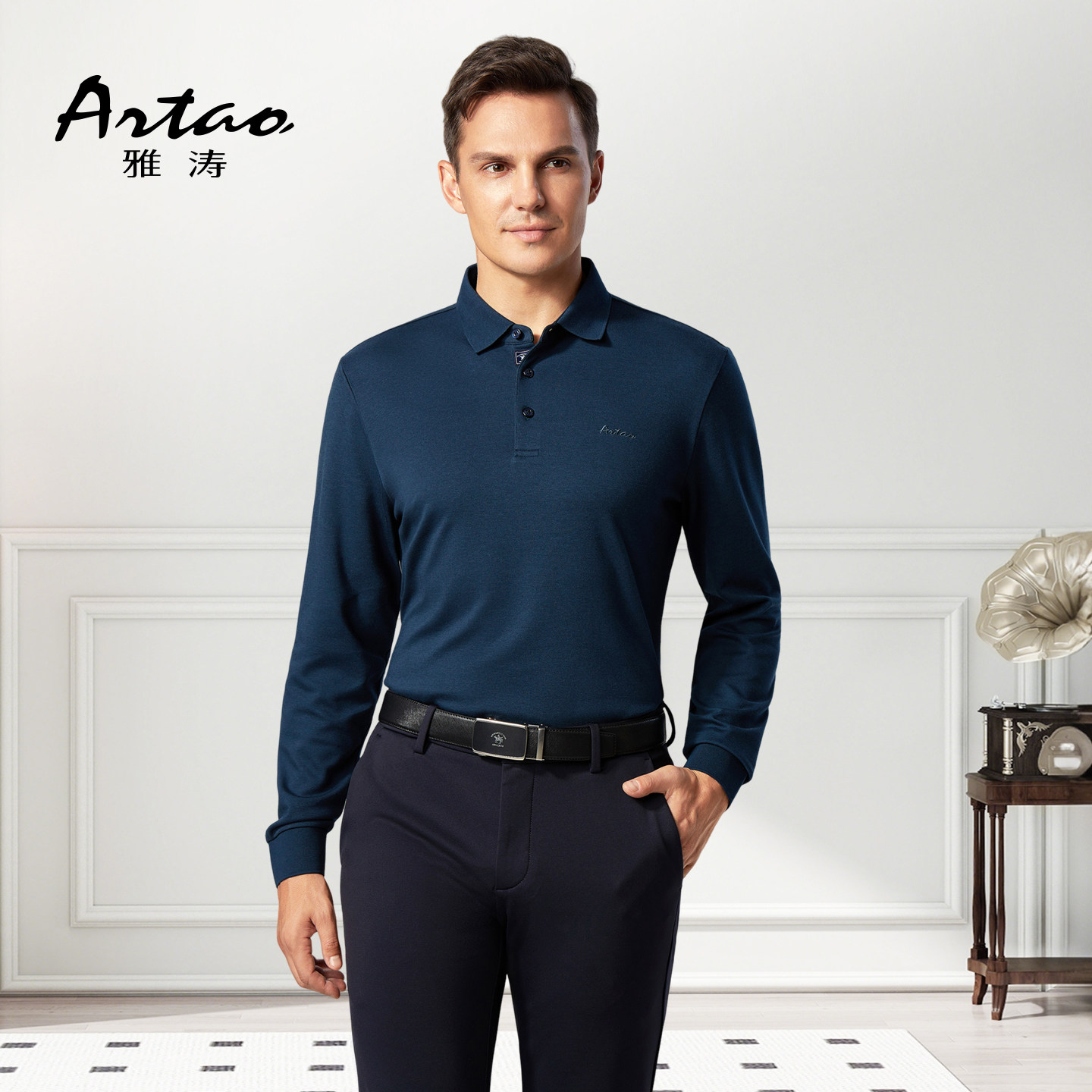 天猫[含羊绒]雅涛男士商务高端桑蚕丝长袖翻领T恤柔软舒适细腻polo衫