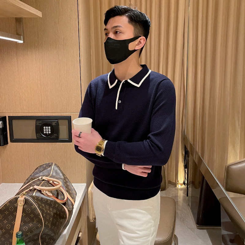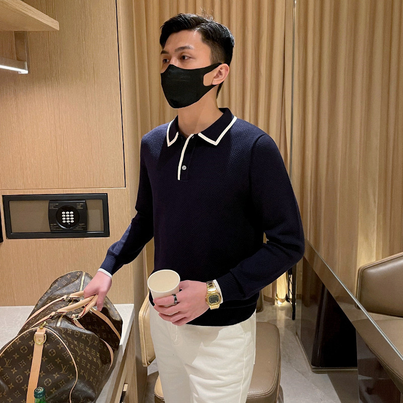 淘法国奢华男装菱格撞色翻领针织衫上衣时尚复古商务男士长袖polo衫