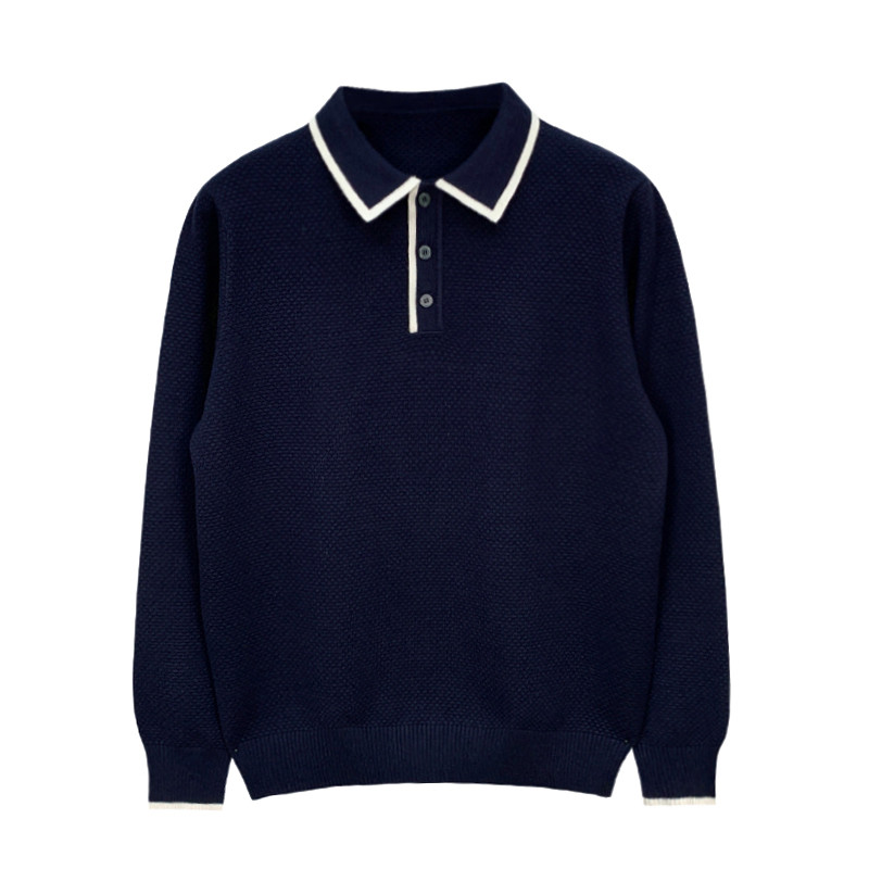 这款复古英伦风拼色领子修身针织衫,融合经典与现代设计,展现男士优雅格调。采用高品质精纺面料,触感柔软、透气亲肤,菠萝纹肌理丰富视觉层次,彰显高端质感。精致的拼色小翻领设计,灵感源自英伦学院风,搭配修身剪裁,凸显挺拔身姿,兼具商务与休闲气质。长袖polo版型得体大方,适合职场通勤或日常社交场合。细节处走线工整,纽扣精致,整体造型简约而不失品味,是追求时尚与品质男士的理想之选,轻松演绎低调奢华的绅士风范。