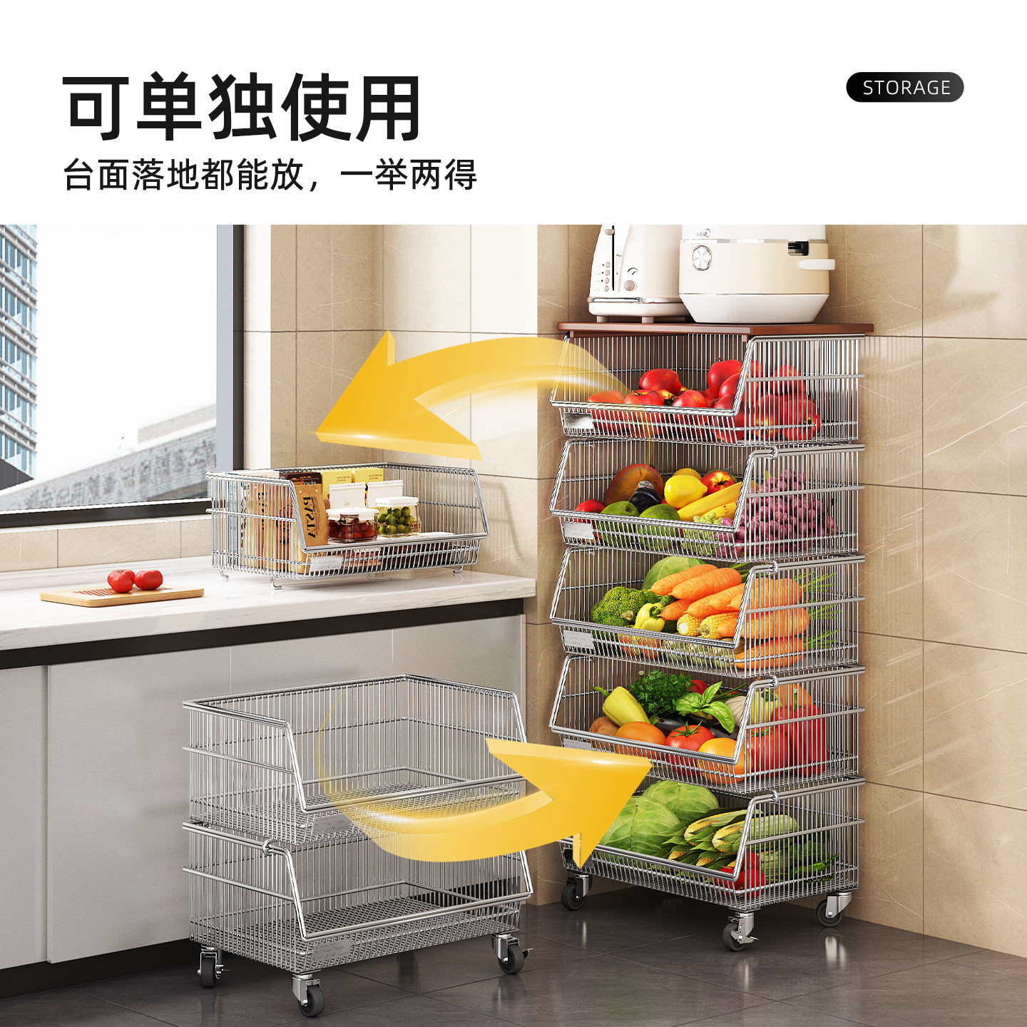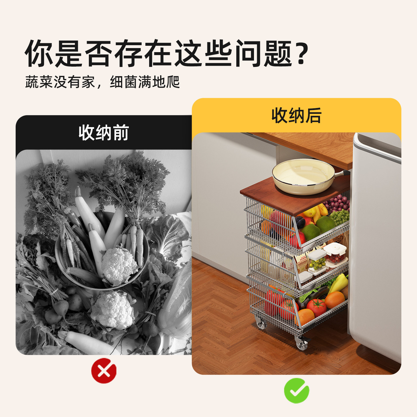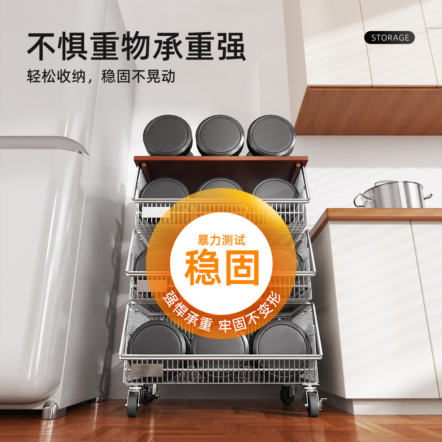 天猫304不锈钢厨房小推车橱柜内置果蔬篮置物架落地可移动台下收纳筐
