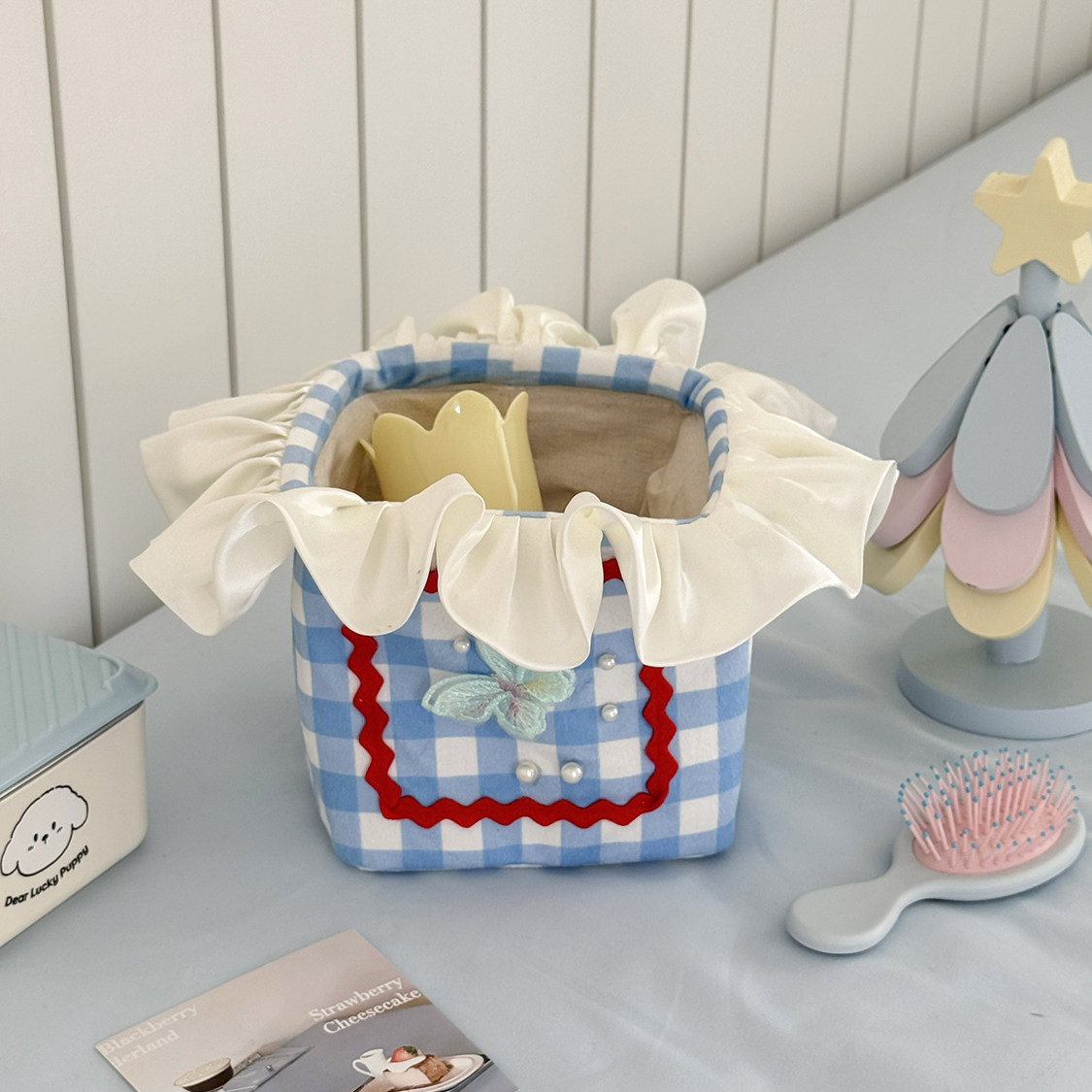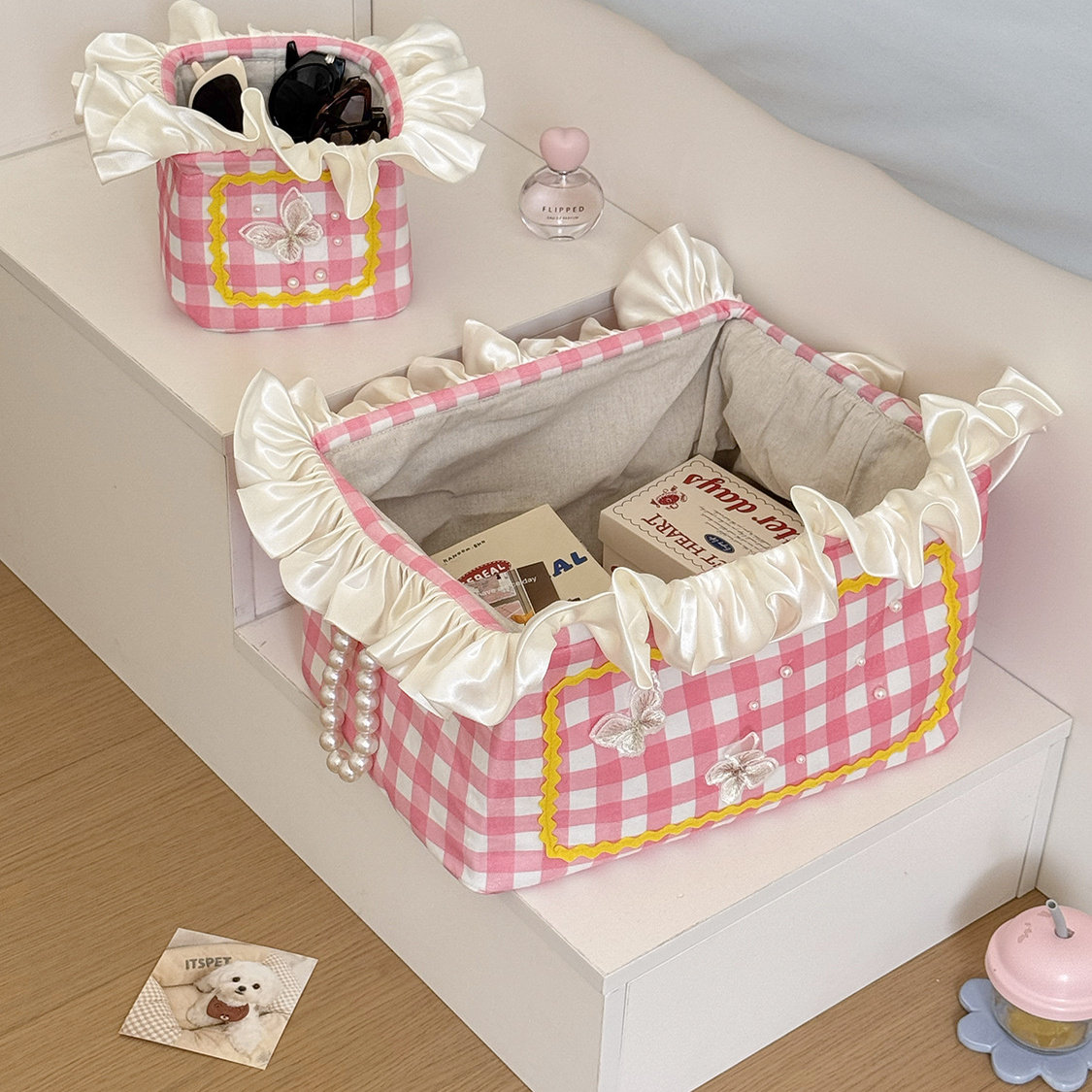 淘宝多功能收纳盒格子花边撞色奶油荷叶边高颜值脏衣筐零食可爱储物篮