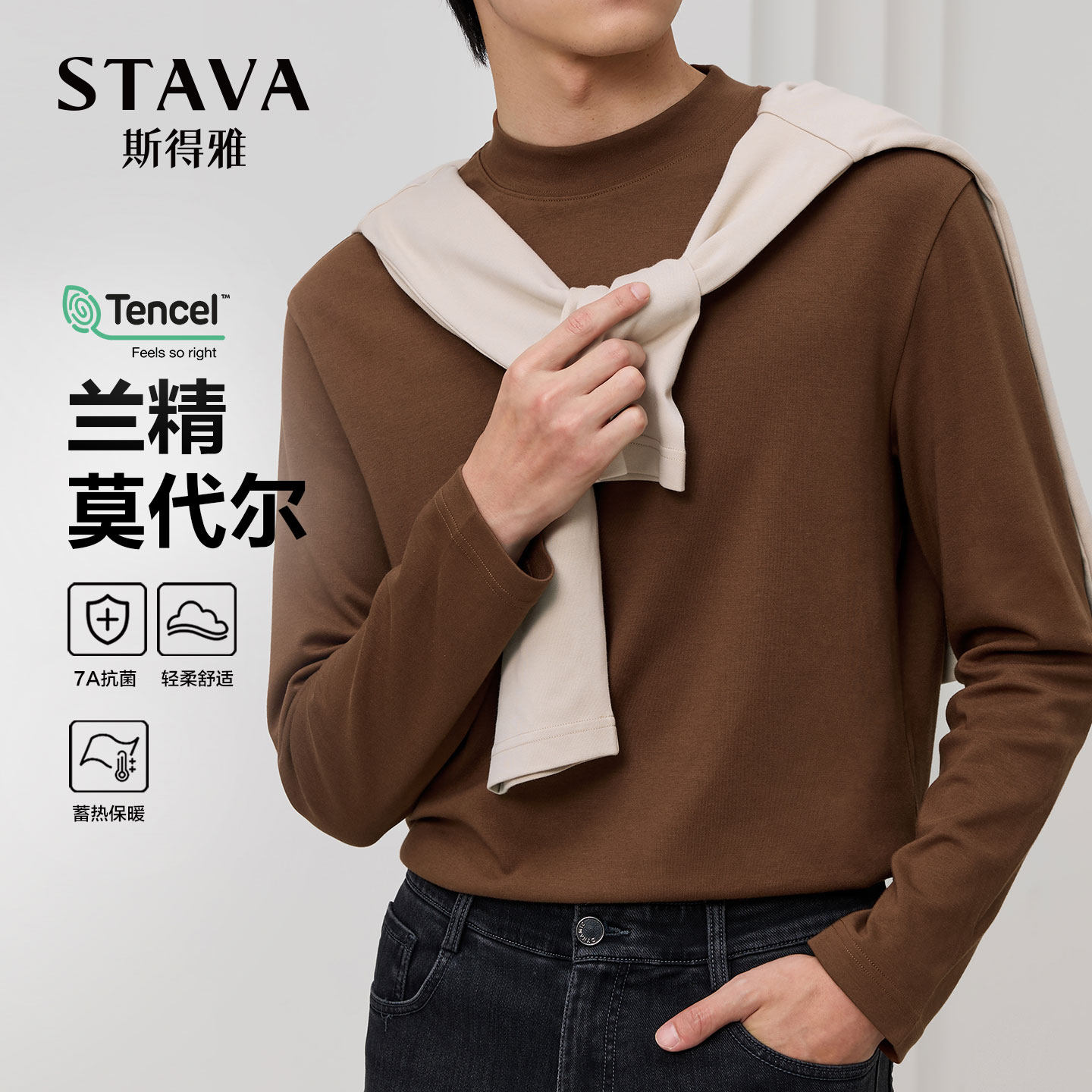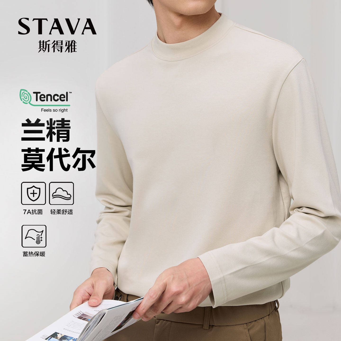 【轻柔莫代尔】斯得雅长袖T恤,采用优质莫代尔纤维与德绒面料混纺,触感柔滑亲肤,透气性佳,贴身穿着舒适自在。半高领设计简约大方,兼具保暖与时尚感,适合秋冬作为内搭或单穿。纯色款式百搭易衬,轻松搭配外套、夹克或大衣,展现男士儒雅气质。弹性适中,不易变形起球,久穿仍保持挺括版型。无论是日常通勤、休闲出行,还是居家穿着,皆能带来温暖与惬意的穿着体验。斯得雅专注品质细节,匠心打造男士基础单品,是秋冬季节的理想之选。
