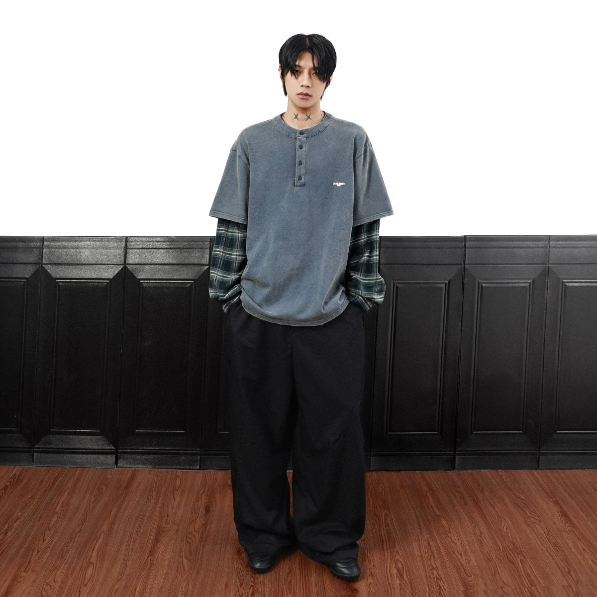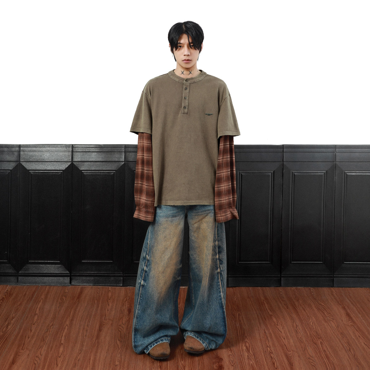 淘宝MRNEARLY美式复古水洗假两件格子拼接长袖T恤男宽松百搭圆领上衣