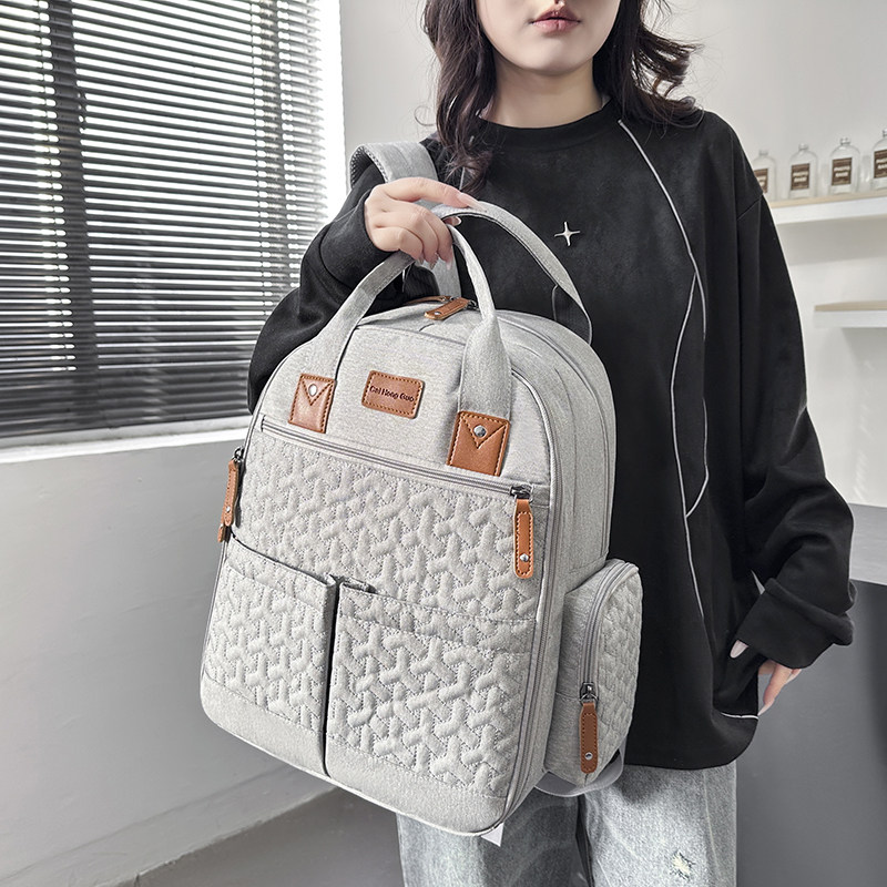 大容量妈咪包,专为宝妈带娃出行设计,集实用与时尚于一体。采用优质防水面料,轻盈耐用,多隔层分区收纳,轻松容纳奶瓶、尿布、衣物、湿巾等母婴用品,井然有序。双肩背设计,解放双手,肩带加宽减压,长时间背负更舒适。侧边设有保温奶瓶袋和抽绳水杯位,取用便捷。包身轻巧不臃肿,可手提、可双肩背,适配多种出行场景,无论是日常遛娃、短途旅行还是逛街购物,都能轻松应对。时尚简约外观,兼顾功能与颜值,是新手妈妈出行的贴心伴侣,让带娃出行更从容、更安心。