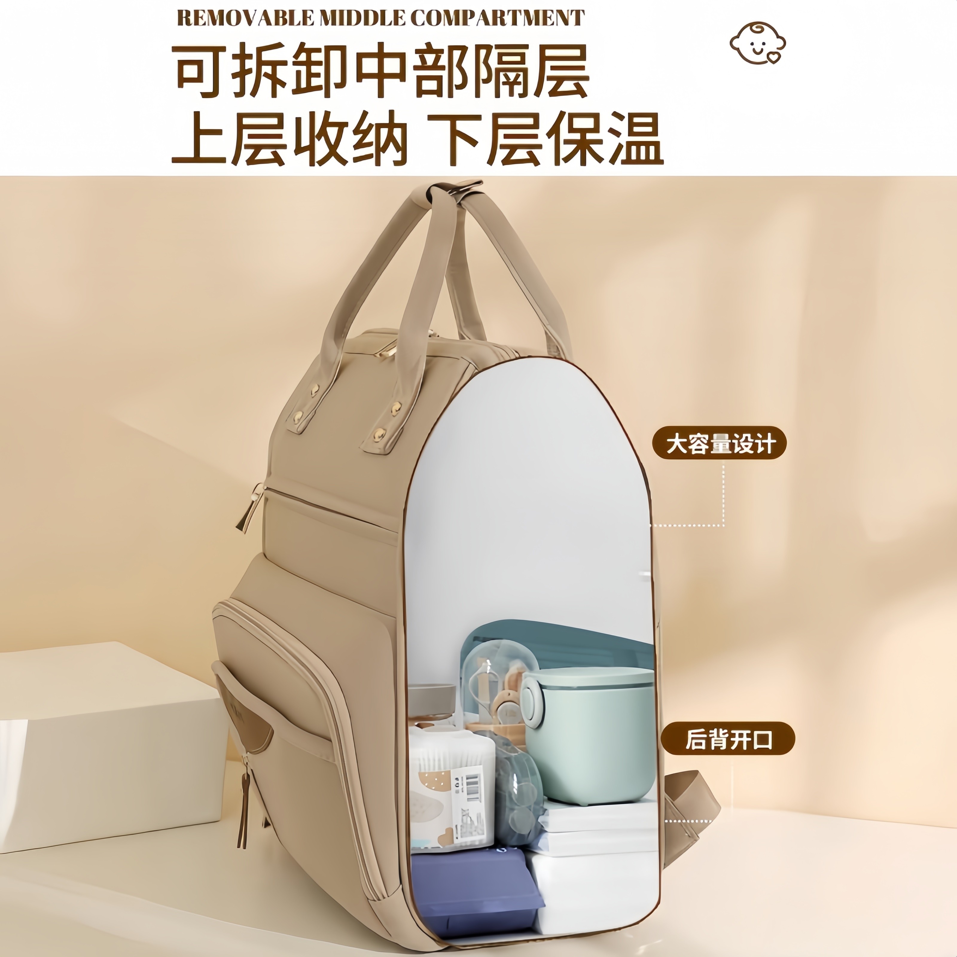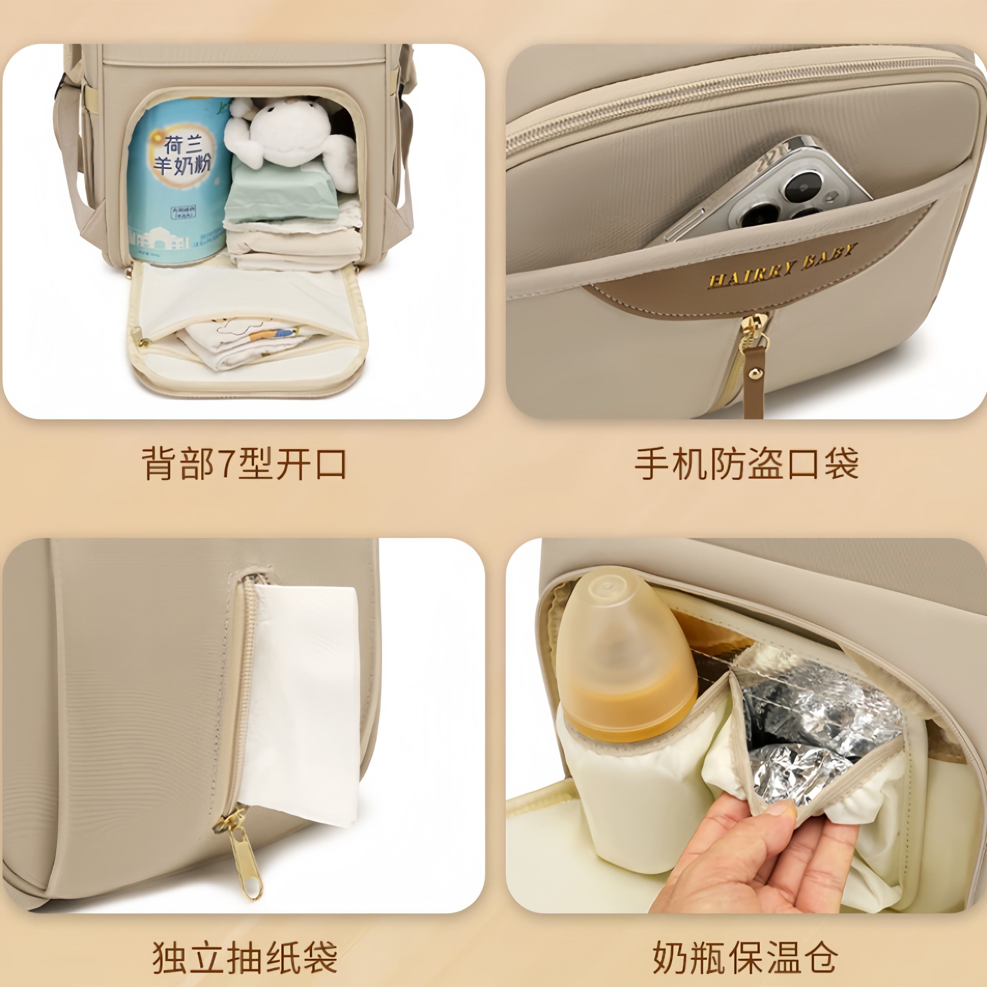 新款妈咪包集多功能、大容量与轻便设计于一体,专为现代妈妈出行打造。采用优质防水面料,有效抵御日常泼溅,轻松应对各种天气。包内设有干湿分离仓,方便分类存放湿衣物、尿布和干爽用品,保持整洁卫生。多隔层设计合理收纳奶瓶、辅食、玩具等母婴用品,取用便捷。双肩背带加宽减压,亦可手提或斜挎,满足不同出行需求。轻量化结构减轻负担,外出更轻松。时尚外观兼顾实用性与美观,是孕期至育儿阶段的理想伴侣,让每一次带娃出行都井然有序、安心舒适。