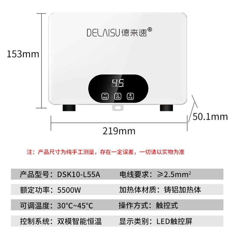 德来速即热式电热水器是一款专为家庭厨房、卫生间设计的节能型小厨宝,采用先进的即热技术,无需储水,开机即出热水,快速满足日常洗漱、洗碗等需求。机身小巧精致,安装便捷,特别适合空间有限的台下或角落位置。下出水设计贴合实际使用场景,水流稳定,加热效率高,节能省电。配备多重安全保护(如防干烧、防漏电、过热保护),使用更安心。无论是冬季厨房洗菜,还是卫生间洗手,德来速都能提供恒温舒适的热水体验,是现代家庭提升生活品质的实用之选。