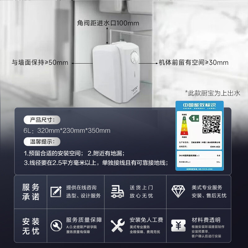 天猫AO史密斯家用小型电热水器厨宝台下上出水速热小厨宝6L升EWH-6C2