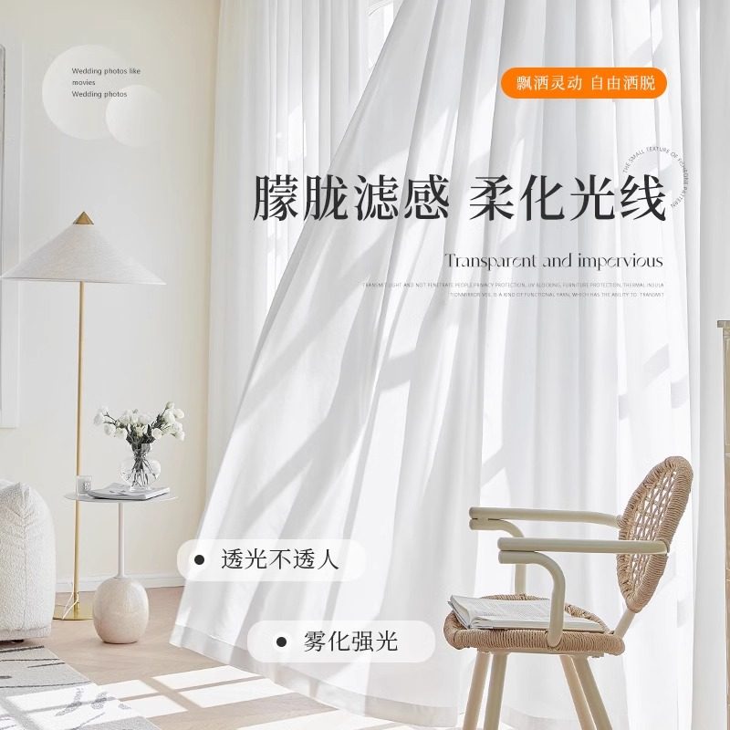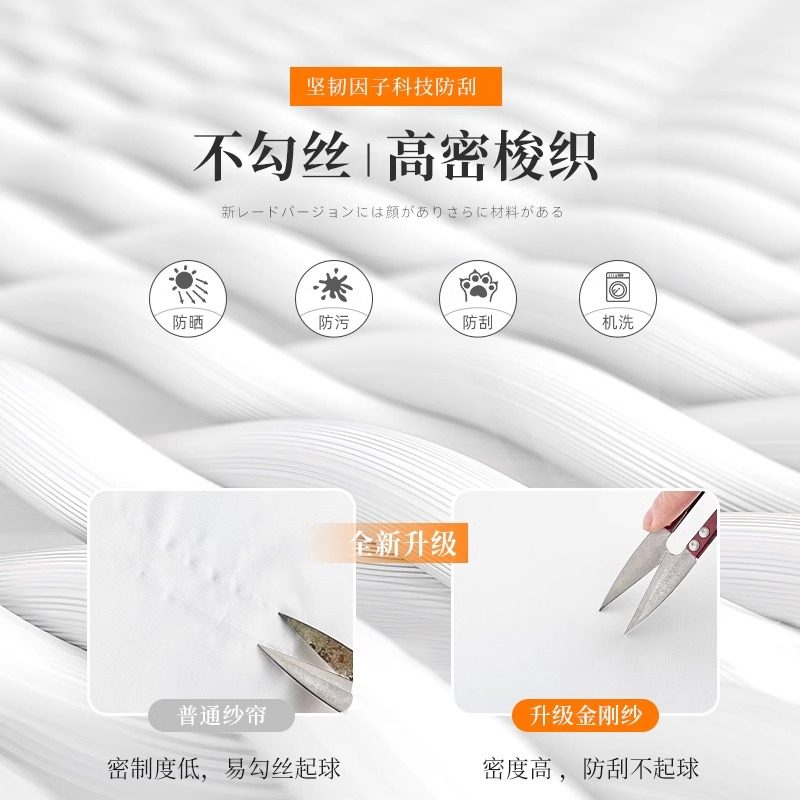 金刚纱帘白纱窗帘,采用高密度聚酯纤维与防猫抓工艺结合,兼具轻盈透光与坚韧耐用的特性。其白色高级感设计,简约优雅,轻松融入现代、北欧或轻奢家居风格。透光不透人的特性,在保障室内采光的同时,有效保护隐私,特别适合客厅、阳台及飘窗使用。表面经过特殊处理,抗撕裂、防勾丝,家有宠物也能安心使用。垂感佳、不易变形,安装便捷,清洁打理简单。无论是营造朦胧柔美的光影氛围,还是提升空间质感,这款纱帘都是理想之选,为家居增添一份静谧与格调。