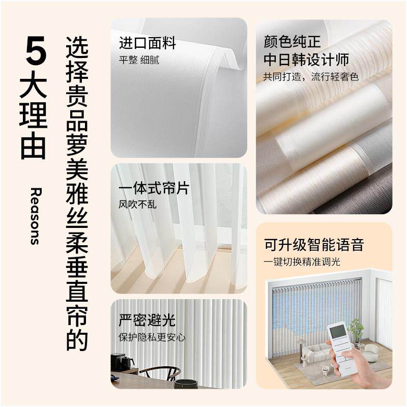 贵品梦幻帘垂直帘竖百叶窗帘,集美观与智能于一体,专为卧室、客厅、阳台等家居空间打造。采用优质面料,透光柔和、遮光可调节,营造舒适光影氛围。独特的垂直叶片设计,可自由调节角度,兼顾隐私与采光。支持电动遥控及智能语音控制(兼容天猫精灵、小爱同学等),一键开合,操作便捷。安装简易,适配多种窗型,现代简约风格轻松融入各类家装。静音电机运行平稳,经久耐用。无论是追求生活品质,还是智能家居体验,贵品梦幻帘都是理想之选,让家居生活更优雅、更智能。
