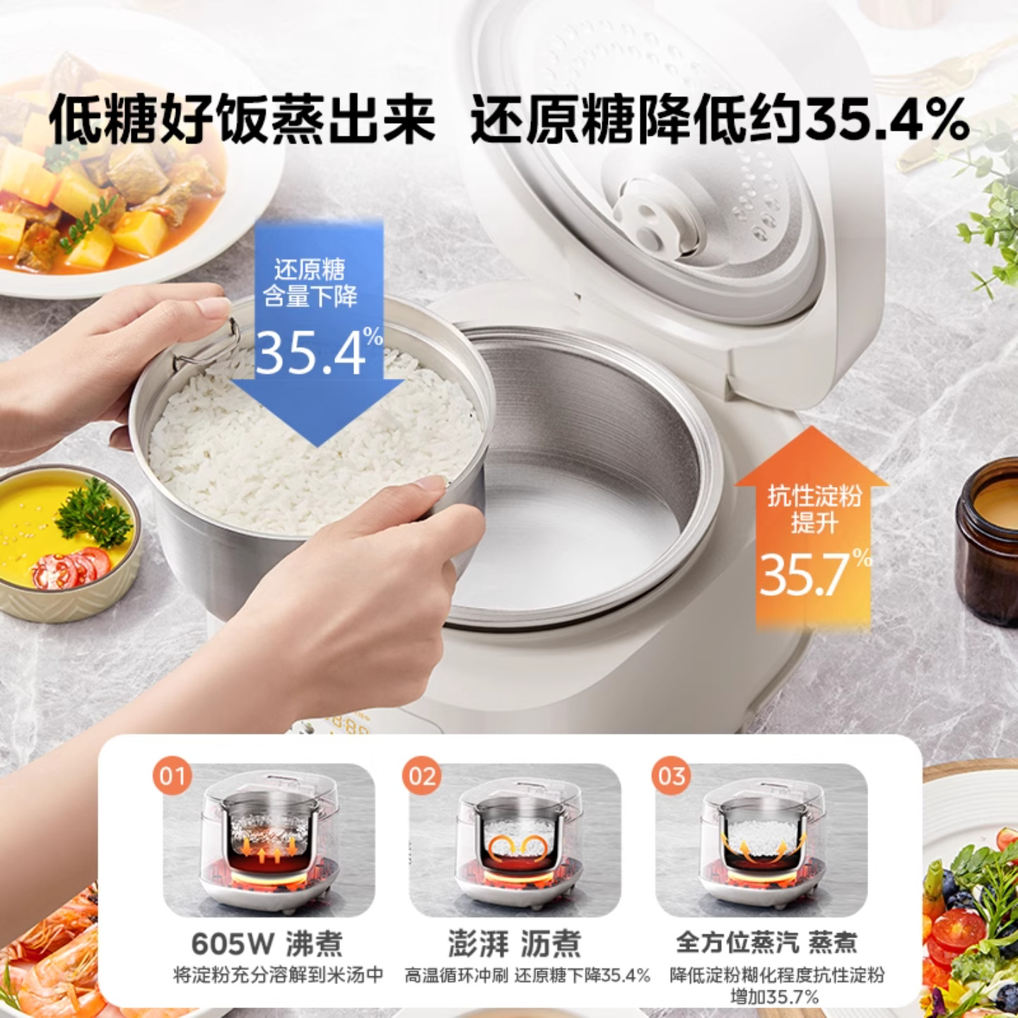 美的低糖电饭煲是一款专为健康饮食设计的智能烹饪机,采用0涂层316L医用级不锈钢内胆,安全耐用,杜绝涂层脱落风险。其创新米汤分离技术,通过滤沥控糖原理,在蒸煮过程中有效降低米饭中的还原糖含量,帮助控制血糖摄入,适合糖尿病患者及减脂人群。小巧机身设计,适合1-3人家庭使用,节省厨房空间。支持多种烹饪模式,包括低糖饭、杂粮饭、蒸煮、煲汤等,一键操作,便捷高效。结合智能温控系统,确保米饭口感松软香甜,营养不流失。美的低糖电饭煲以科技赋能健康饮食,让控糖生活更轻松、更安心。