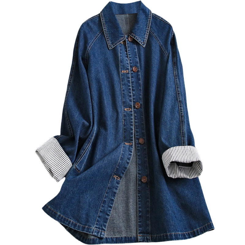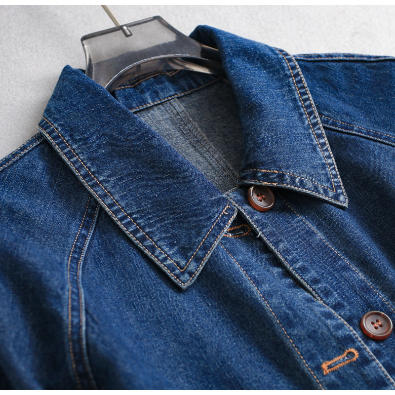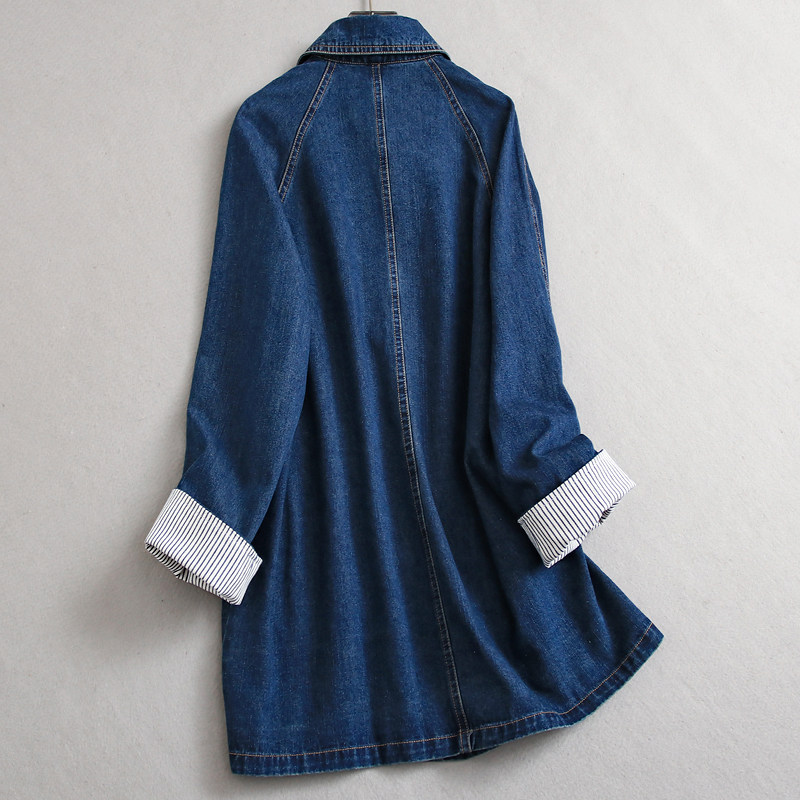 淘宝复古水洗丹宁风条纹卷边长袖翻领中长款牛仔外套小个子风衣女K873