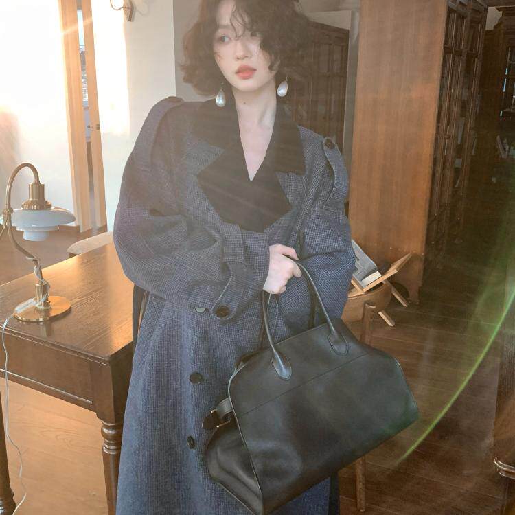 淘文艺休闲风衣中长款秋冬装韩版新款宽松气质流行呢子外套黑色